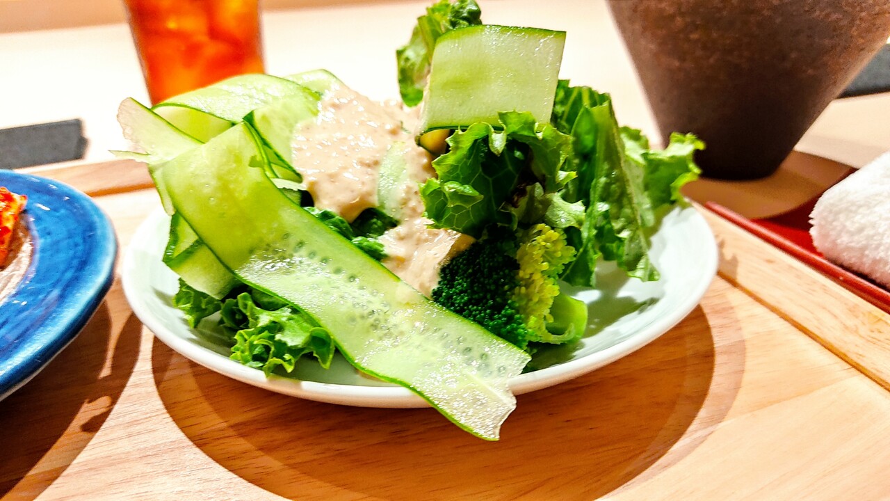 その間に サラダを頂きます (きゅうり、レタス、ブロッコリー、ラディッシュ)