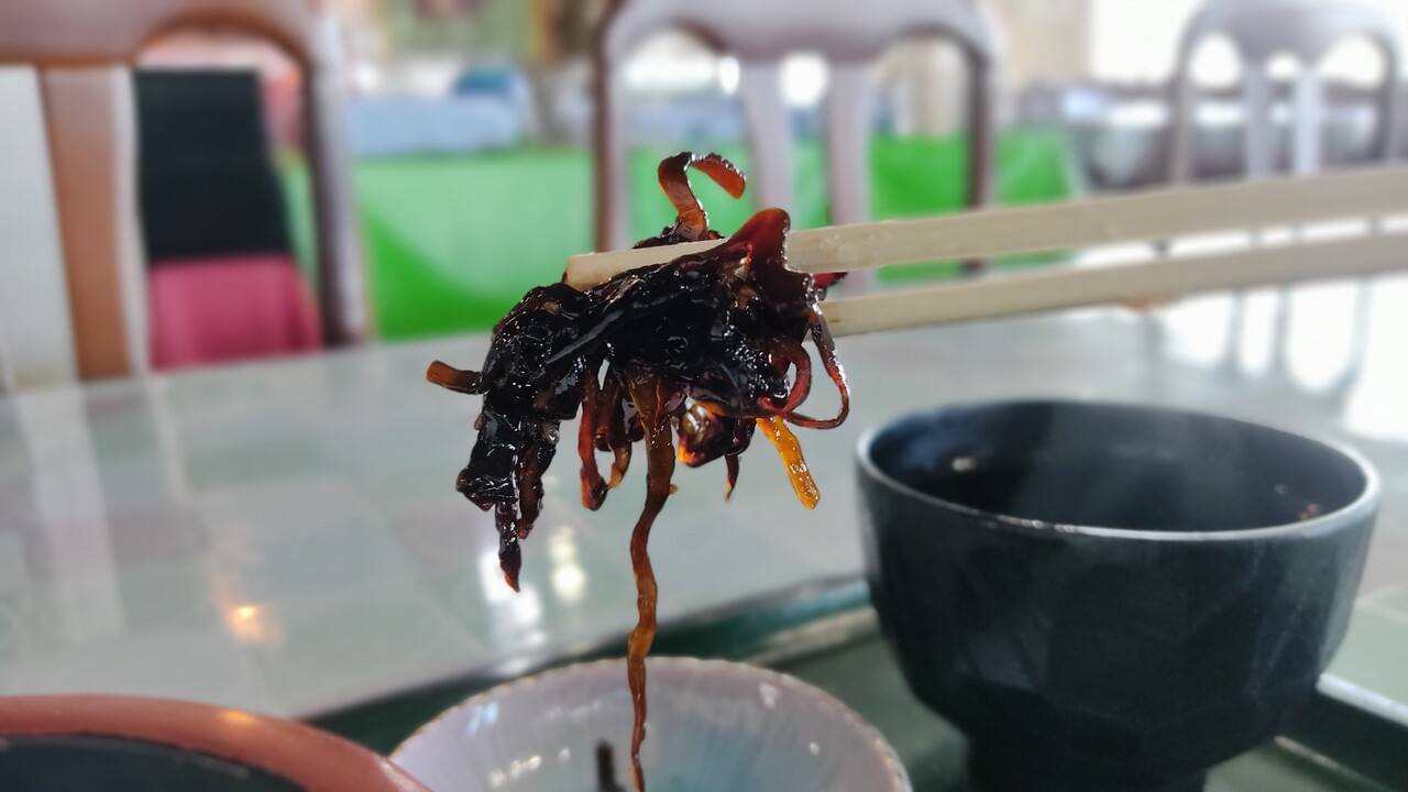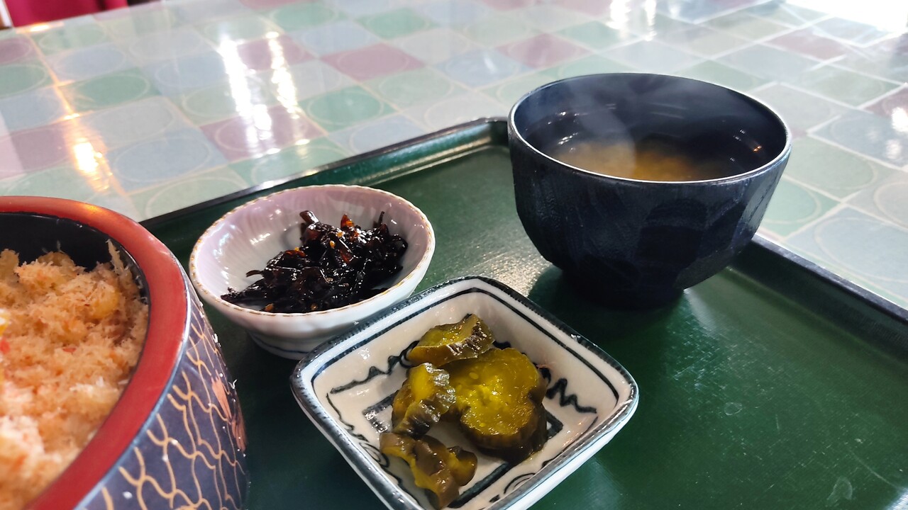 かにめしだけ食べていると口の中が甘くなるので漬物食べて 昆布の佃煮を食べて 口の中の甘みをリセットし また かにめし食べて