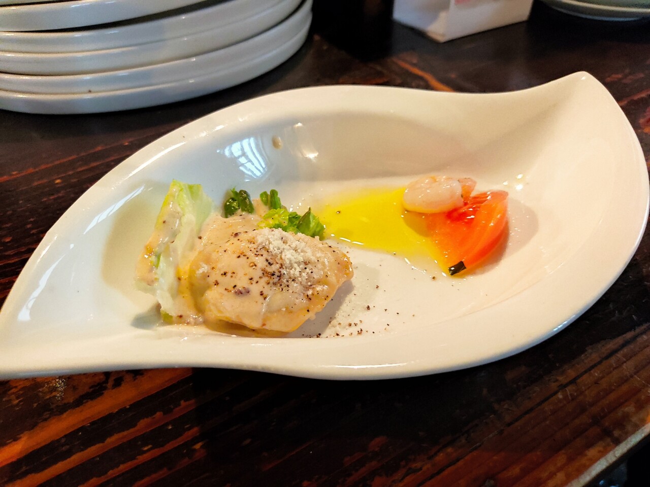 前菜は 鶏肉とエビとトマトと野菜の内容となります