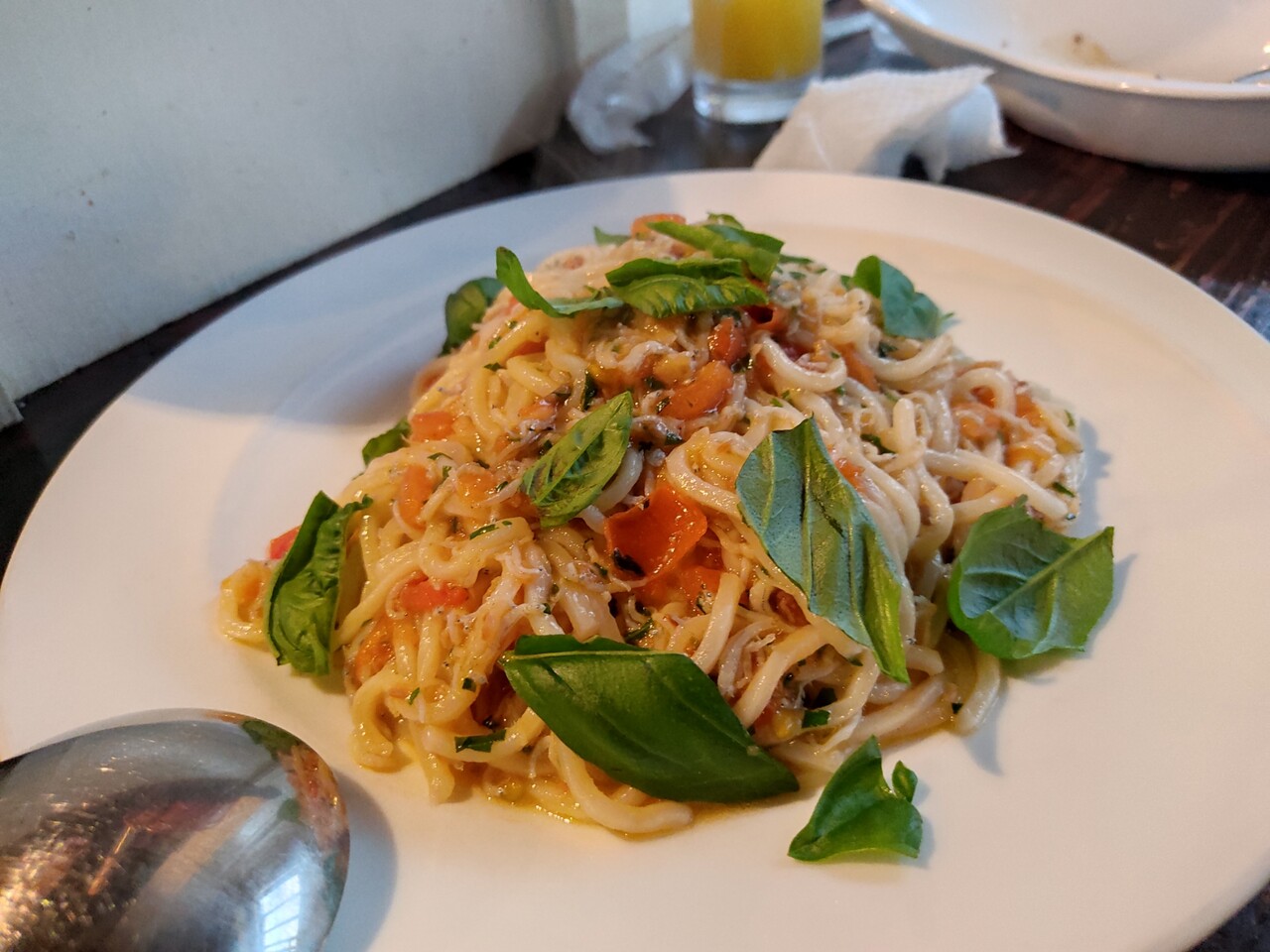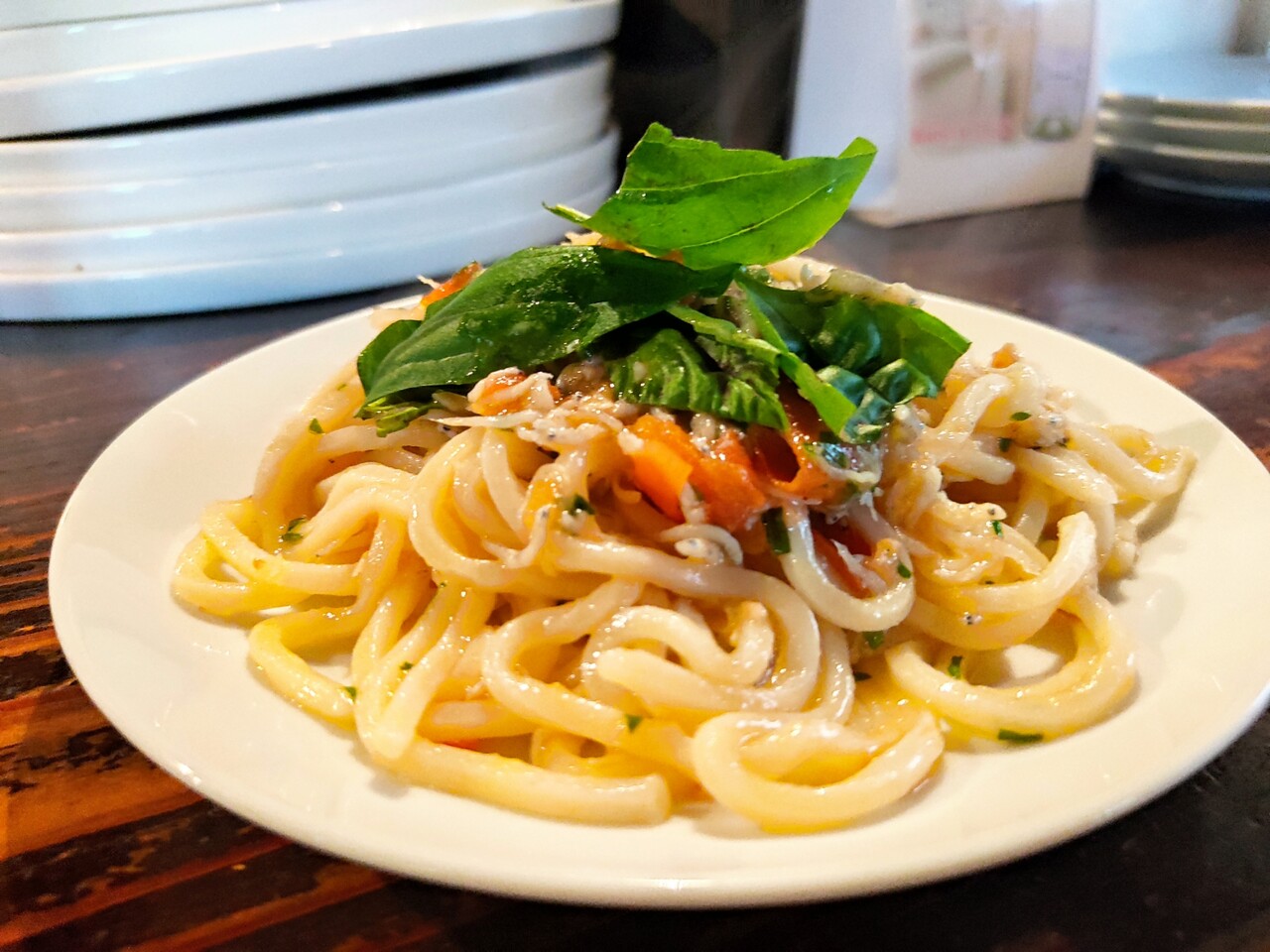 生パスタにバジルと しらす、そして生トマト