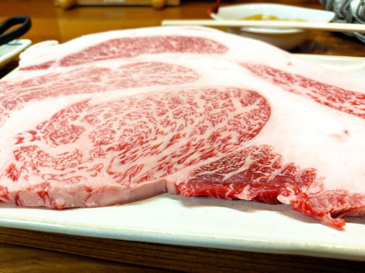 A5ランクの鹿児島産の黒毛和牛のリブロースの断面 サシが綺麗に入っております