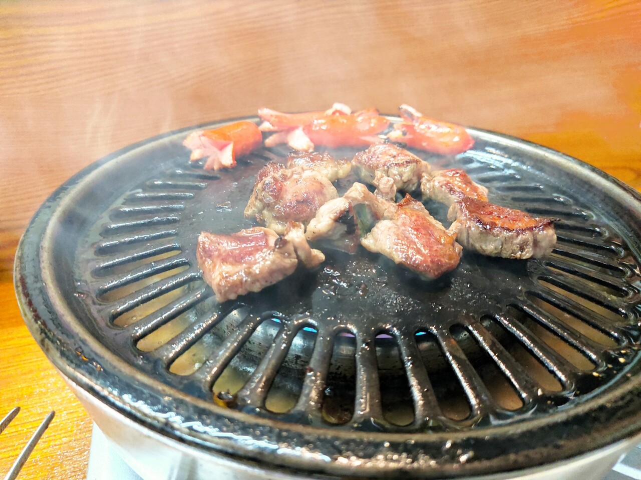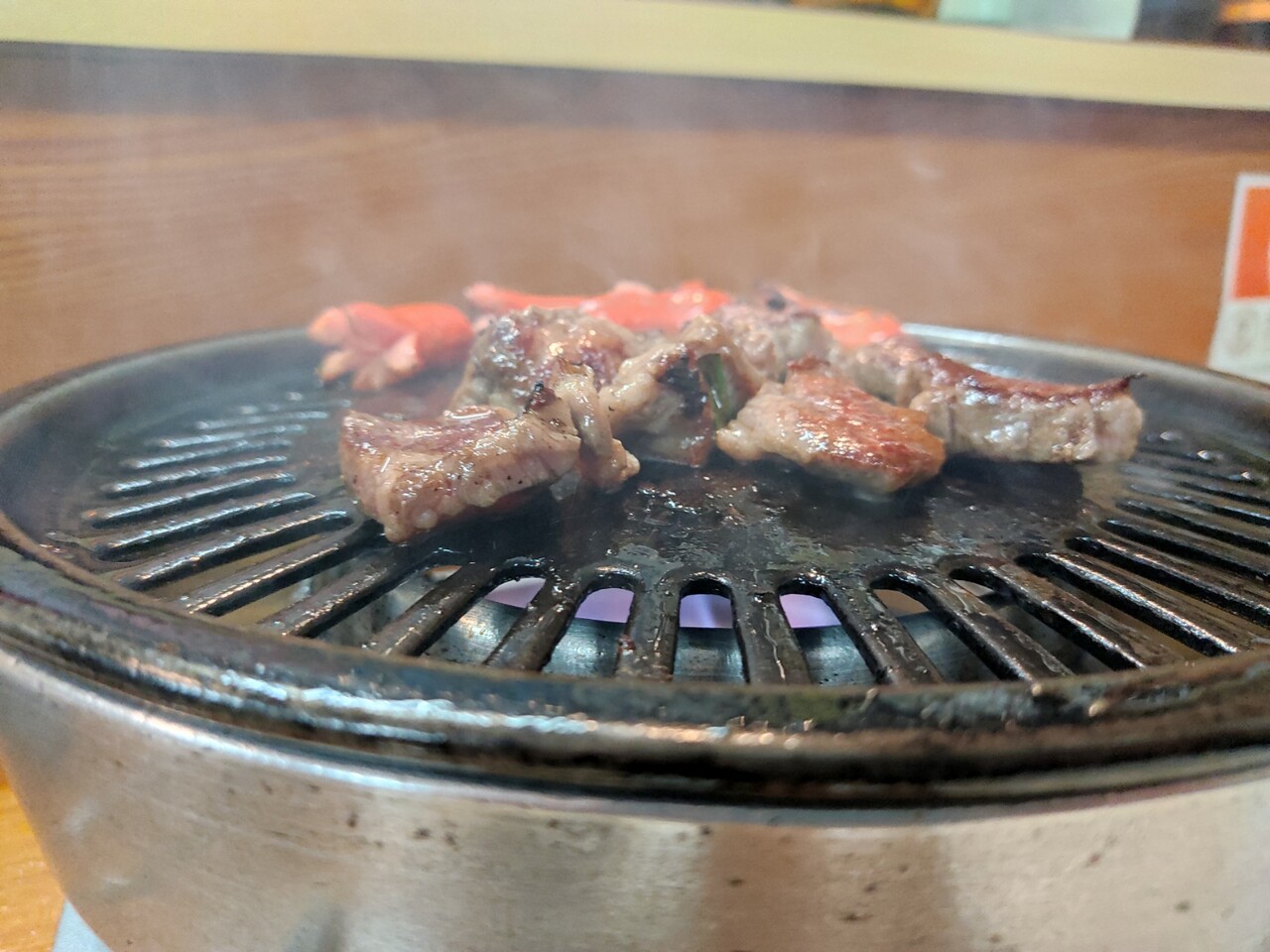 焼いていくと肉は縮み そして肉の良い香りが煙として辺りを覆います