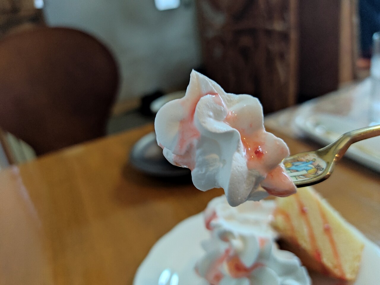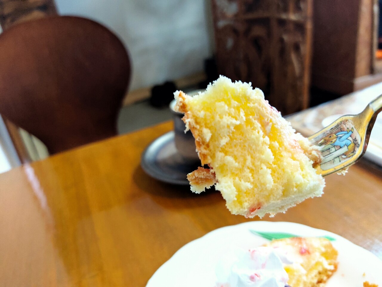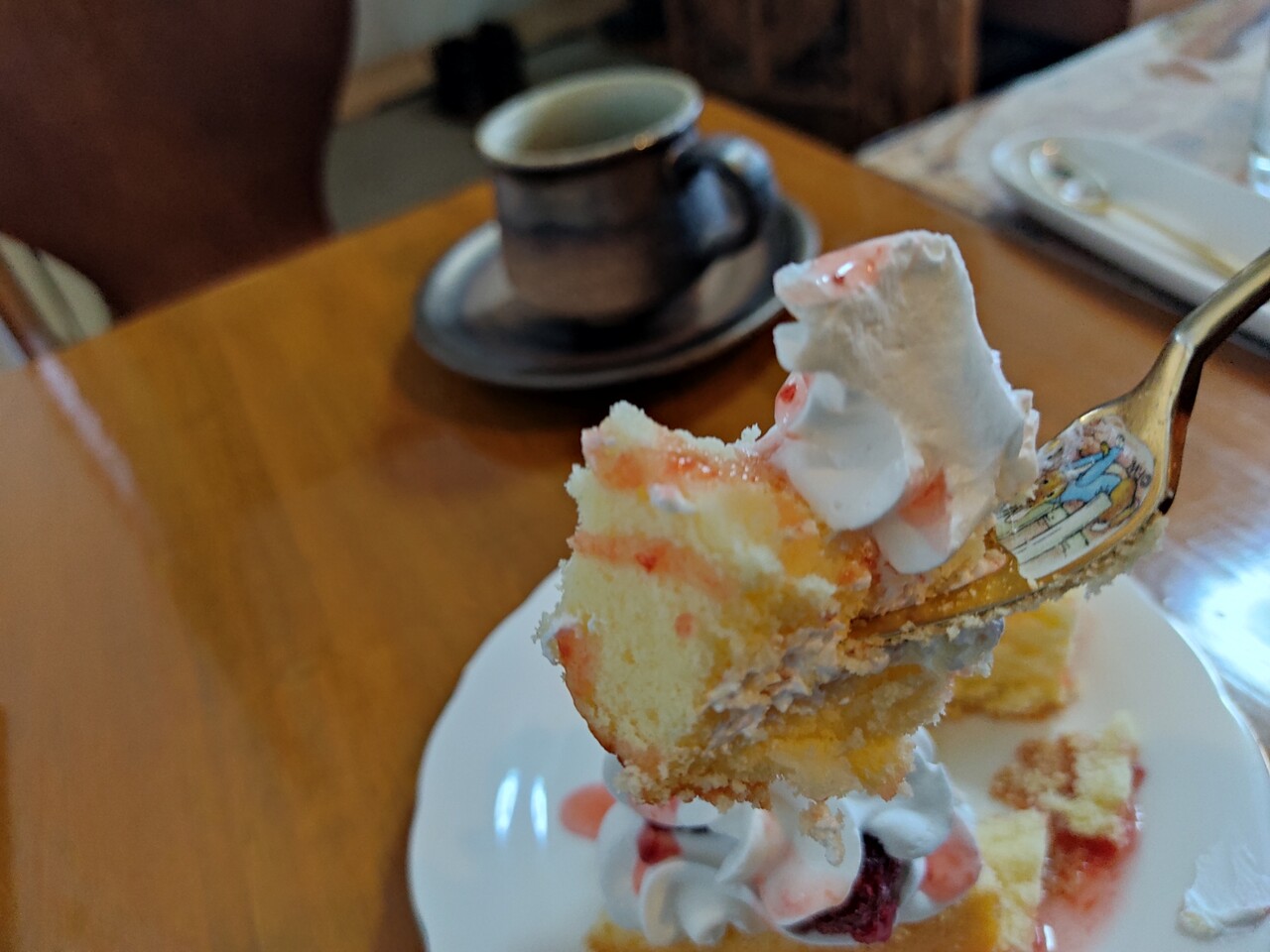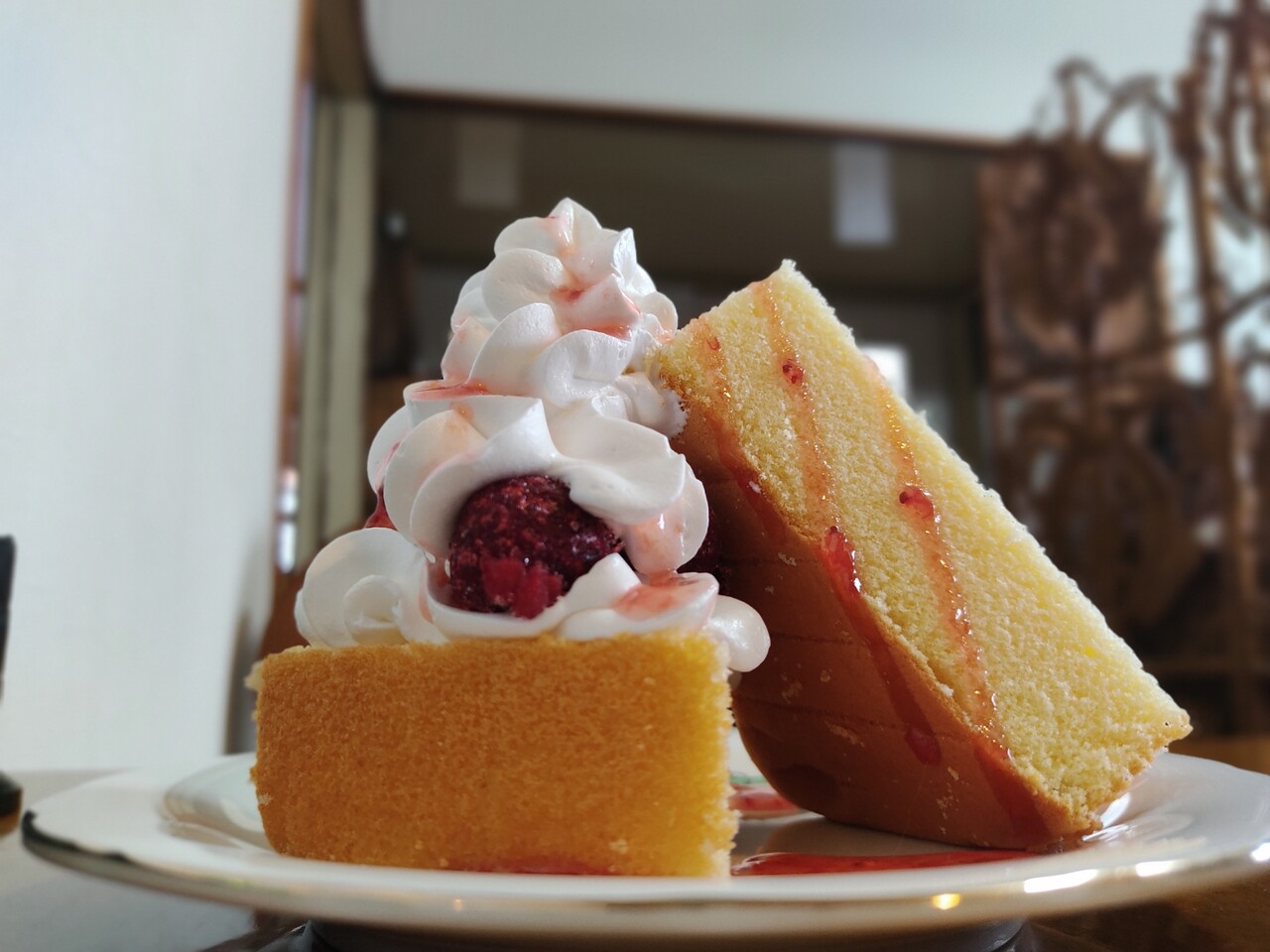 からの ケーキにラズベリーと生クリームを添えて頂くとラズベリーの甘酸っぱさと生クリームのまろやかさ ケーキのふわふわ感が三つ巴となり美味しいんです