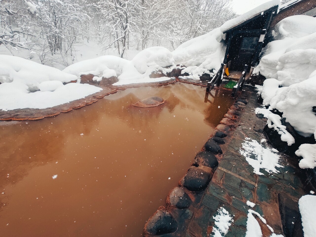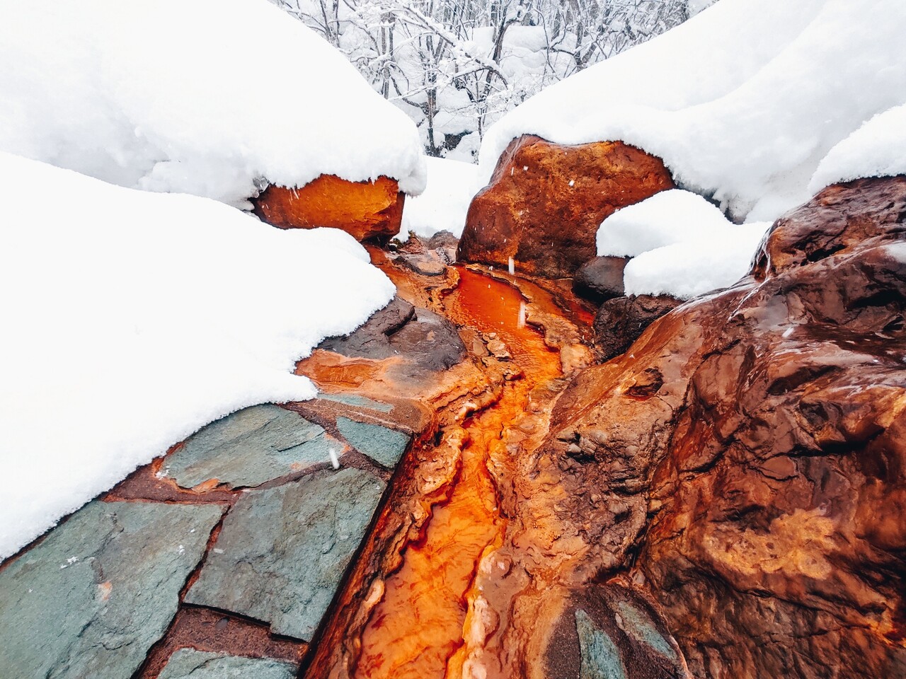 温泉はオーバーフローしており その温泉は川に流れて行くのですが 温泉成分の堆積物が味わいがあり良いんです