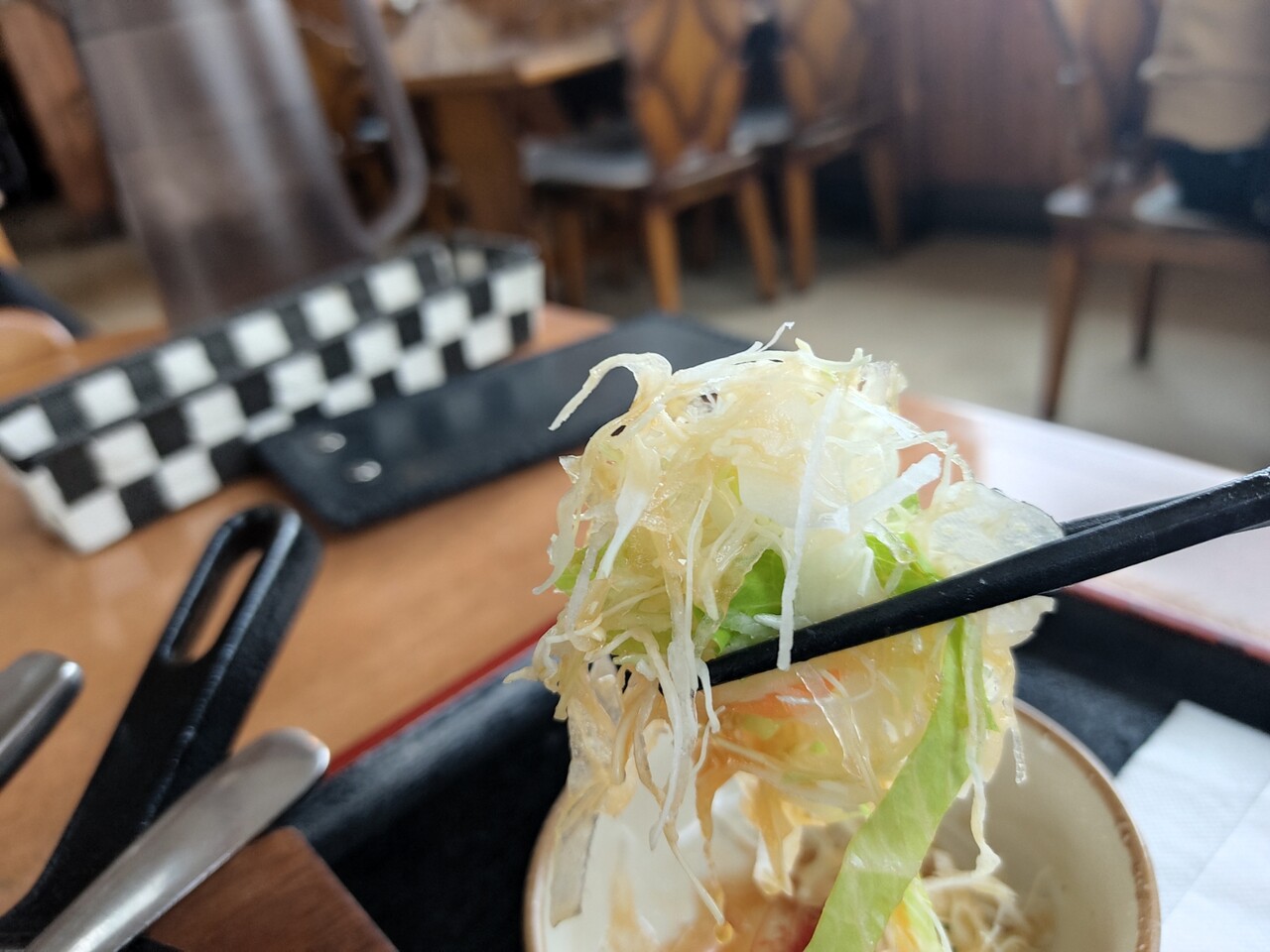 サラダを挟んで ハンバーグを食べ