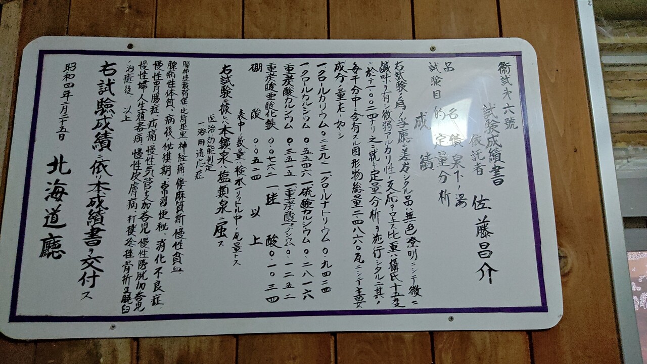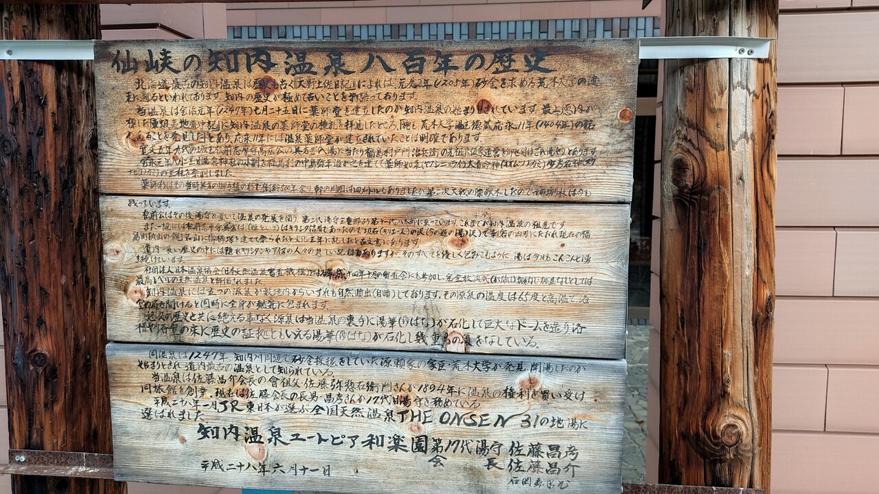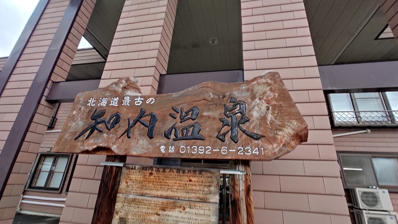 北海道最古の温泉知内温泉の看板がドンとあります。最古と言われる所以は開湯あら800年 西暦で言うと1,200年代から存在している温泉なんです