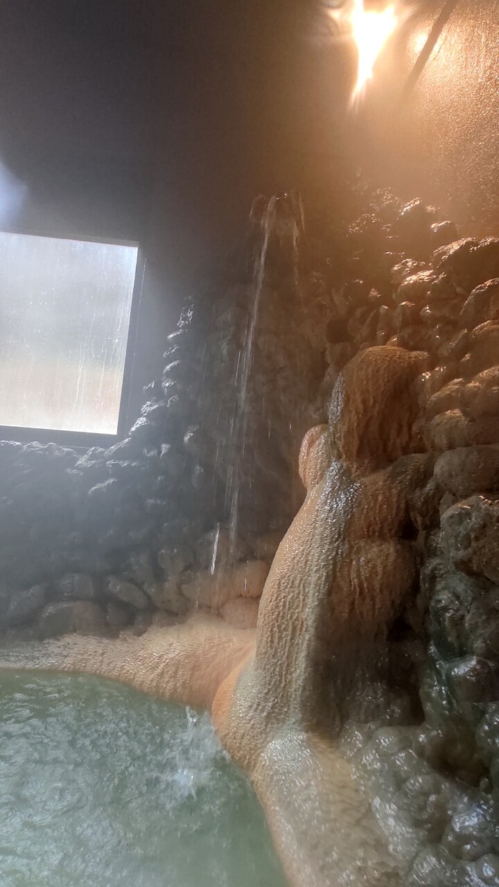 温泉は高い場所から流れており 堆積物で良い感じの岩風呂