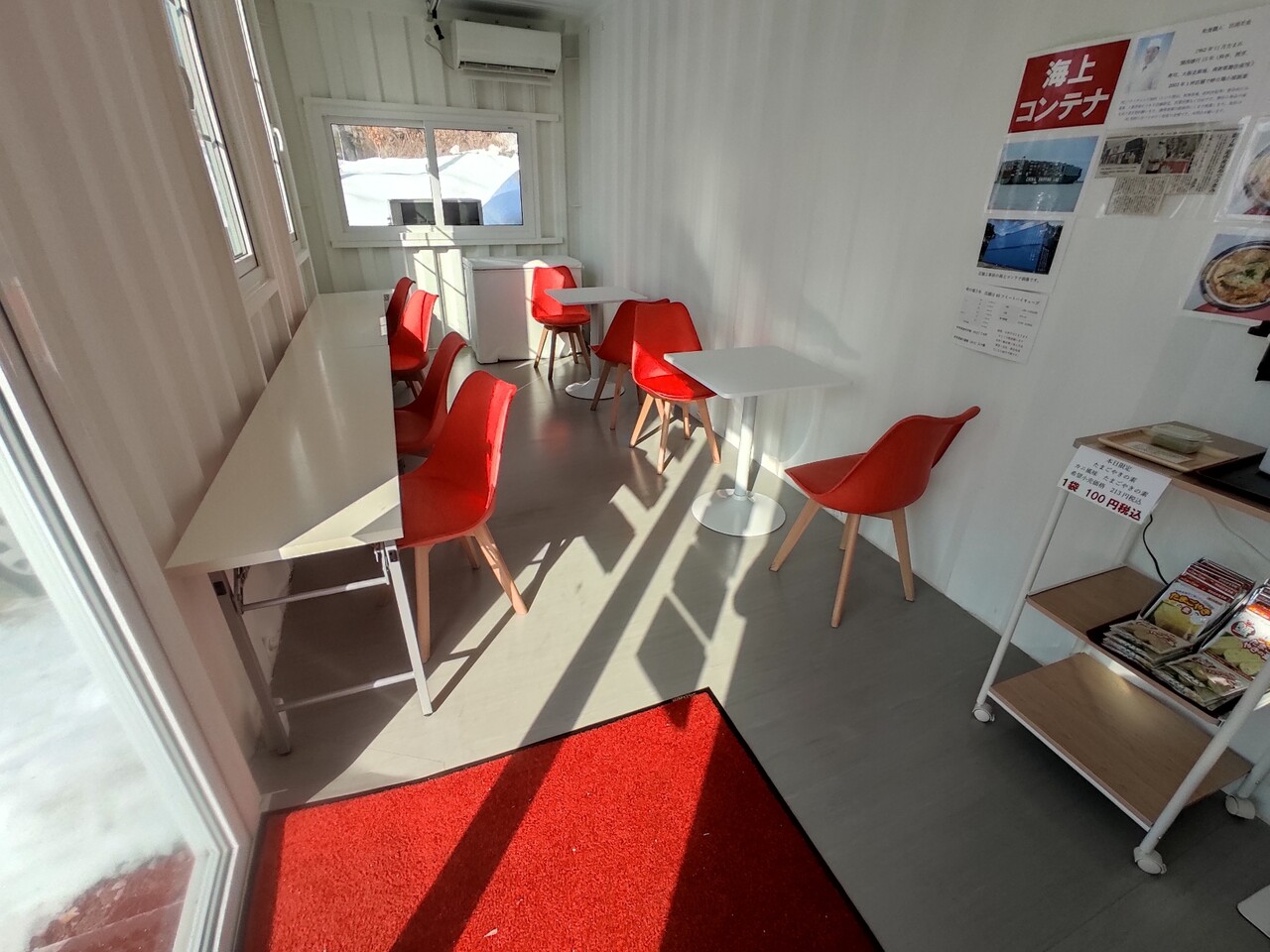 店内はコンテナなので横に長いのですが それほど窮屈感はなく 色を基調とした色合いなので 広さを感じる店舗となります