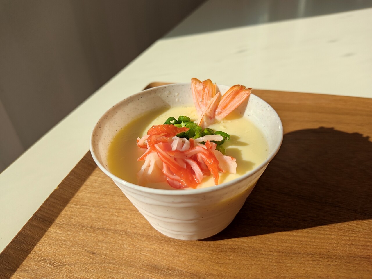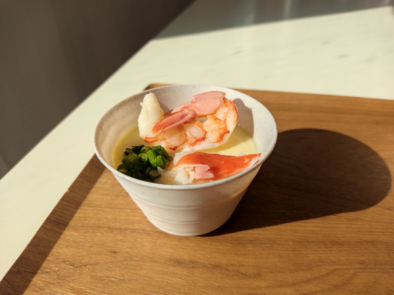今回は通常の冷えた茶碗蒸しで海老が 上に乗ったもの、もう1つは出来立て熱々の海老が茶碗蒸しの中に入っている物をご用意して頂きました