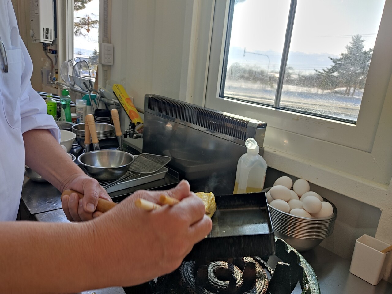 卵が焼かれ クルッと巻かれ 途中宙舞うたまご焼き 何度か繰り返されたら はい!出来上がり!