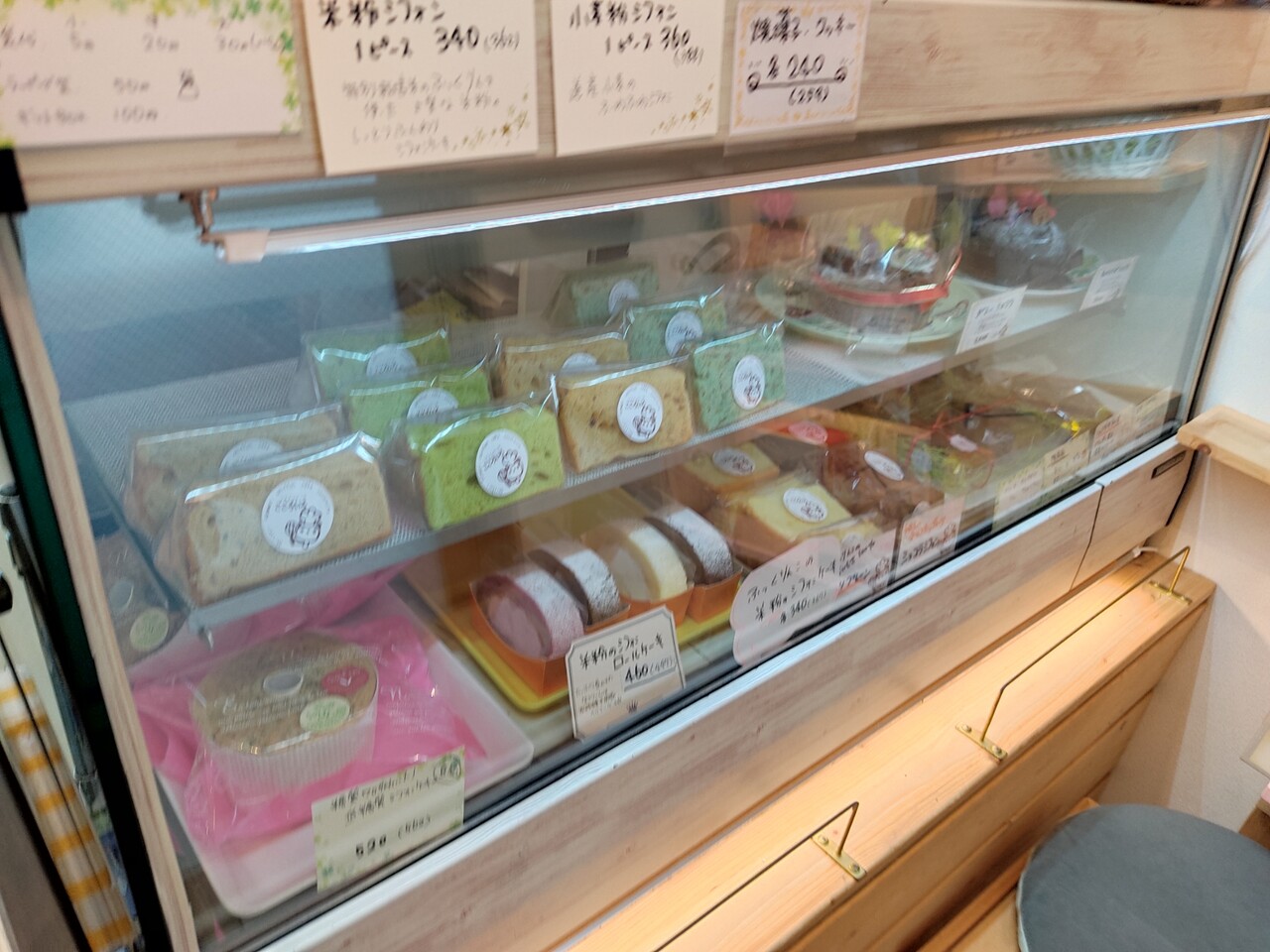 正面ガラスケース内シフォンケーキ、ロールケーキ等メインの商品も並べられております
