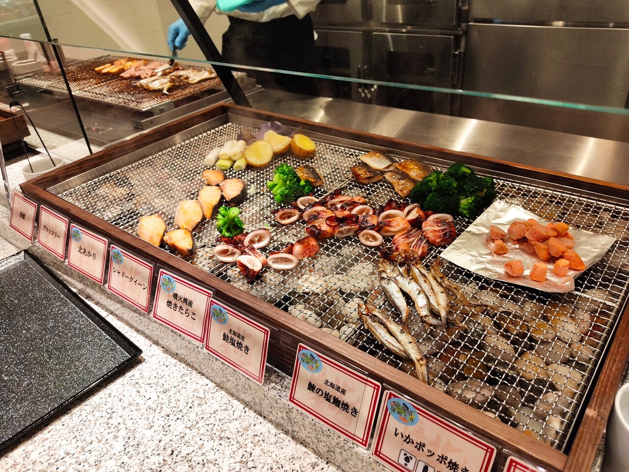 炉端焼きで タラコ、ししゃも、いかぽっぽ焼き、鰊、社会、じゃがいも、ブロッコリーと色々焼かれております