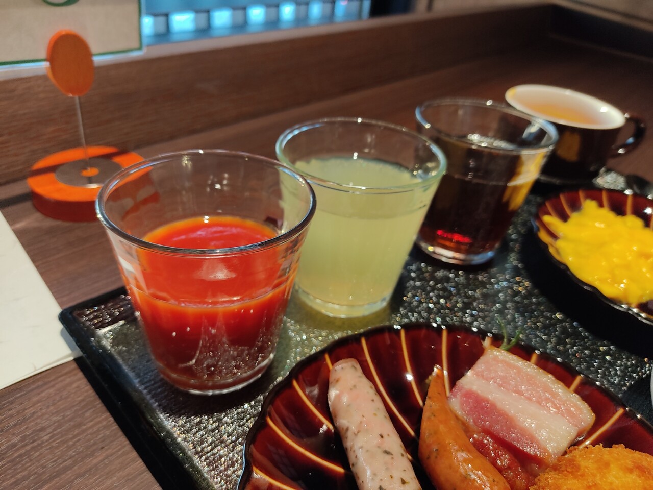 飲み物(トマトジュース、リンゴジュース、烏龍茶)、オマールビスクスープ