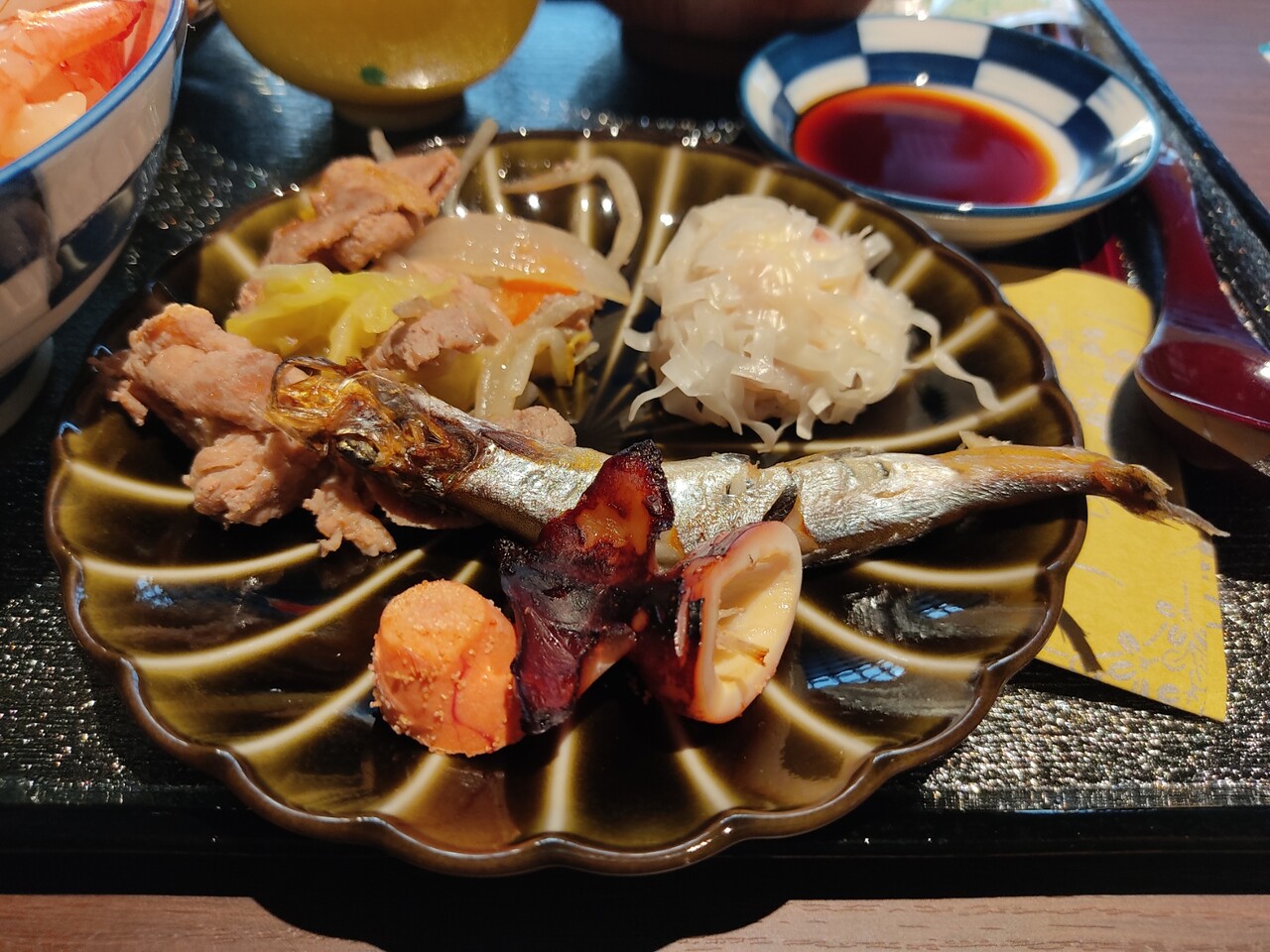 豚肉のジンギスカン、カスペの煮付け、芋もち、唐揚げ