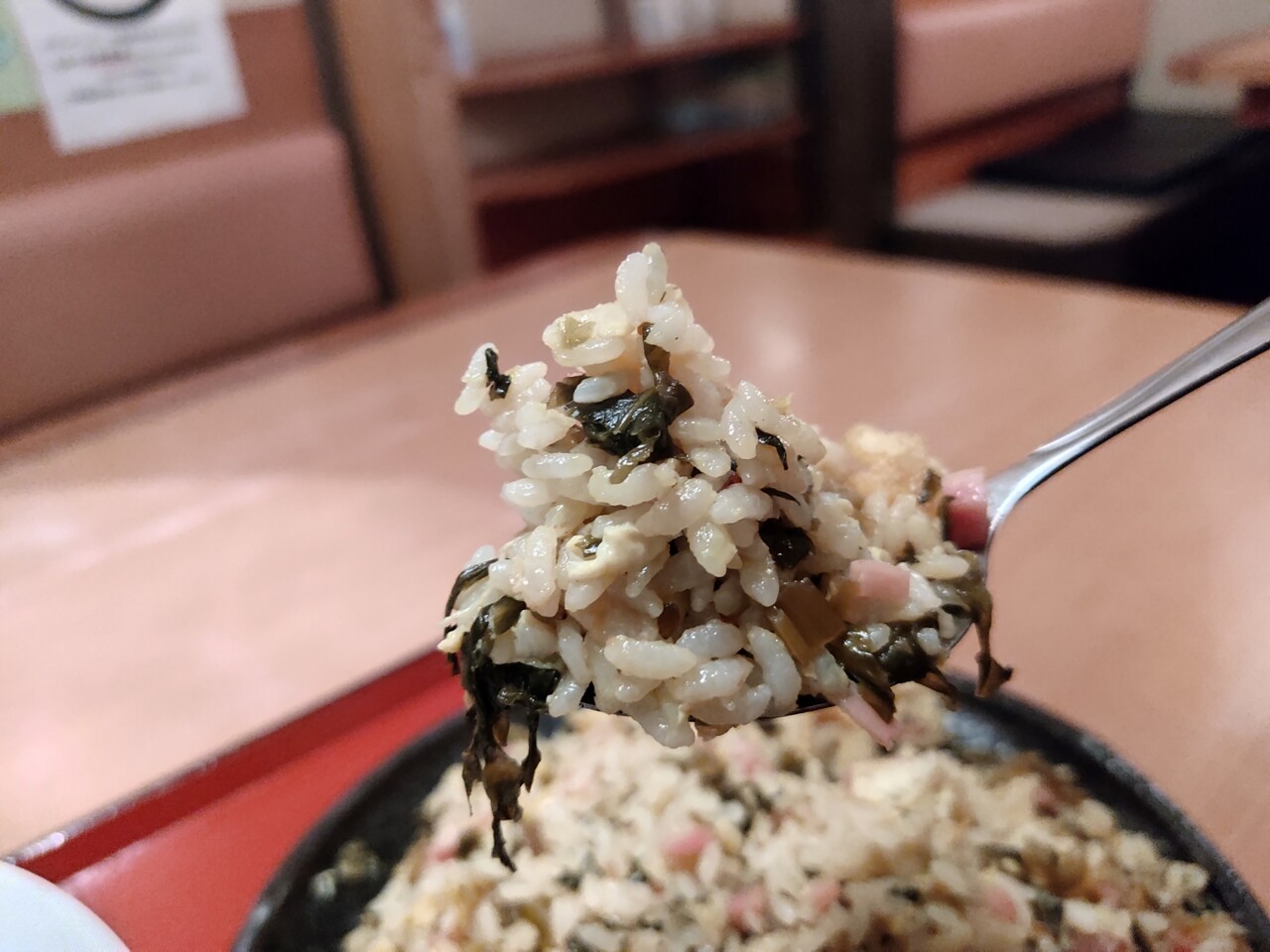 スプーンで高菜炒飯の山を崩して 口に運びます
