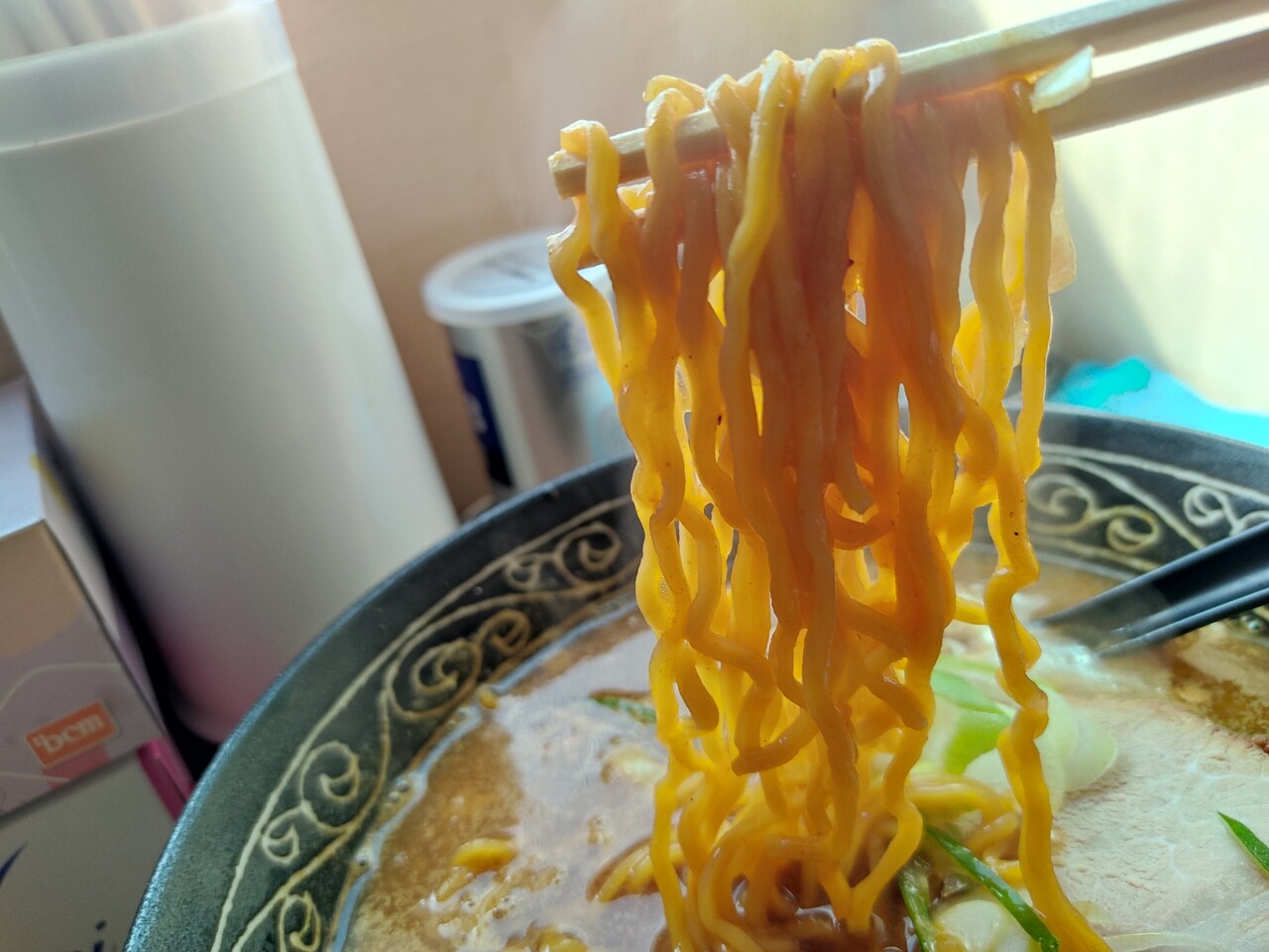 スープは熱々オイリーでサラっとしており飲んでみると 辛さは一切ないんですけど結構塩っぱく