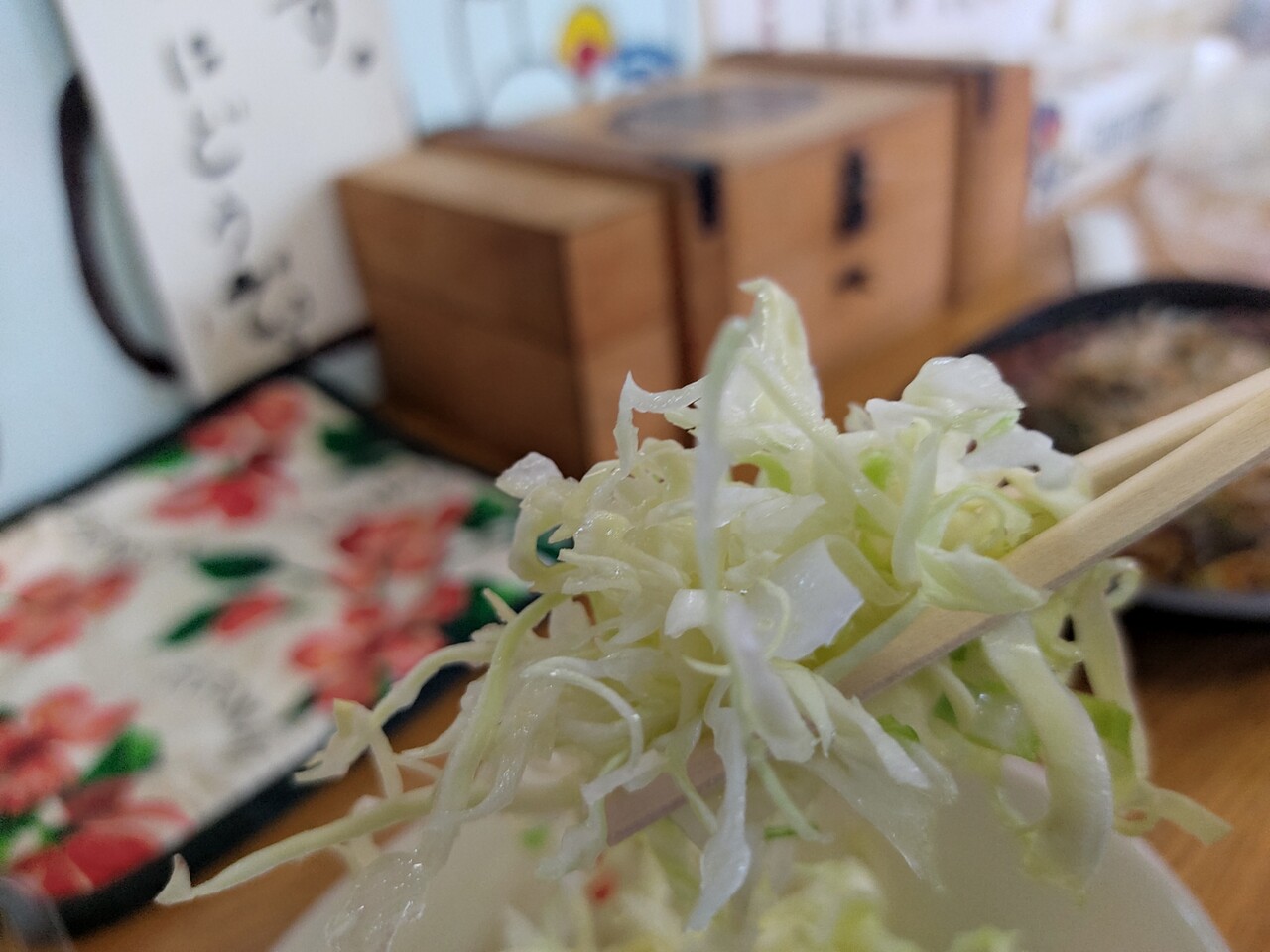 そして店内でカウンターで食べていたのですが キャベツの千切りを食べる?って言われたので はい!と答えると はい貰いましたよキャベツをね