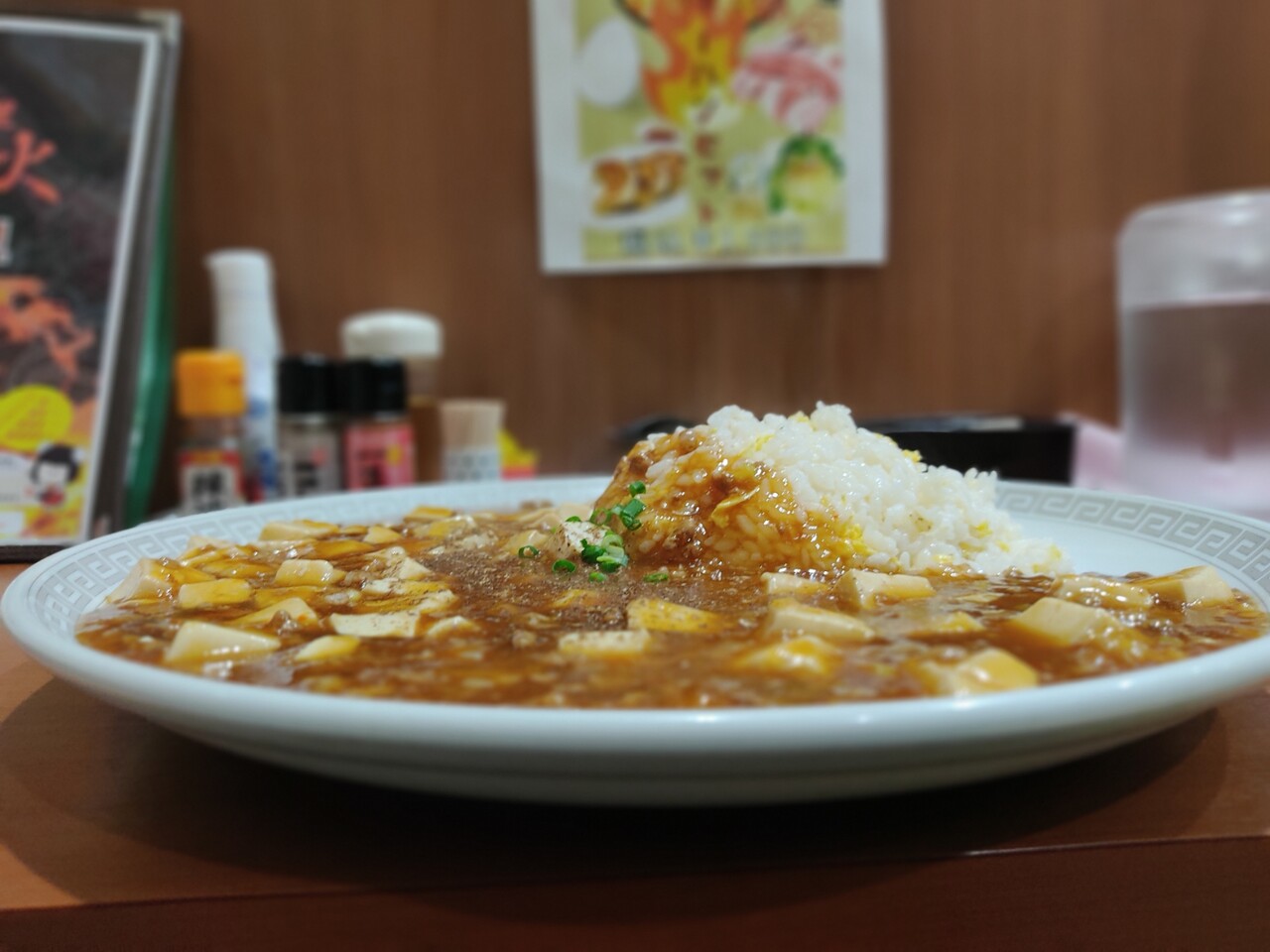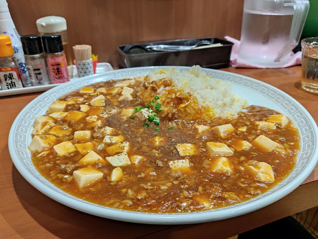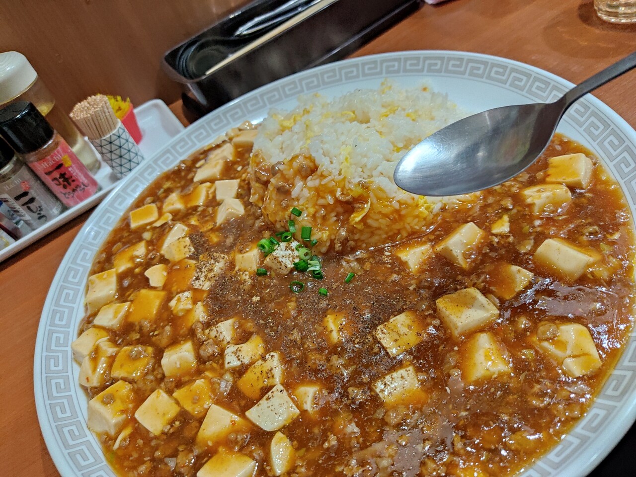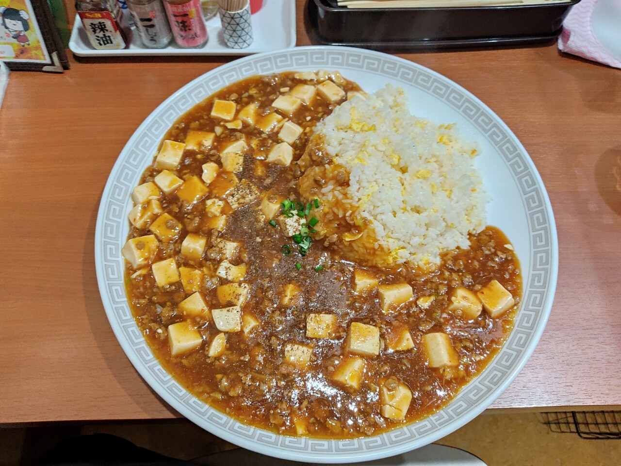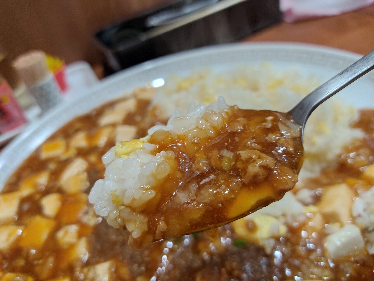 相変わらずのインパクト!麻婆の海に炒飯の島が浮かんでいるかのようですね
