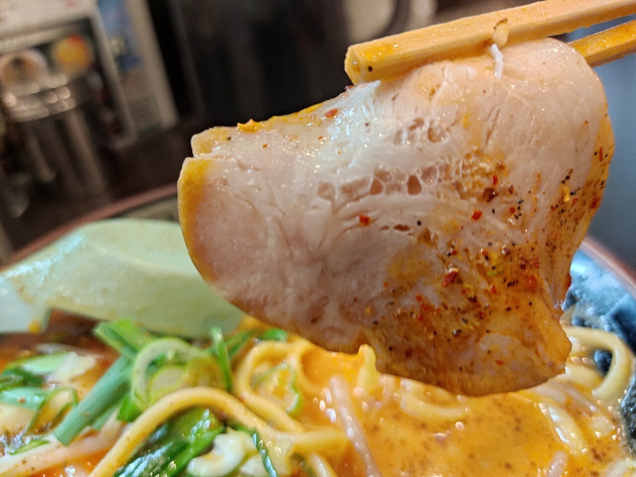 とろとろチャーシューはこの辛味のあるスープに対して甘みを感じるバラ肉チャーシューで美味い