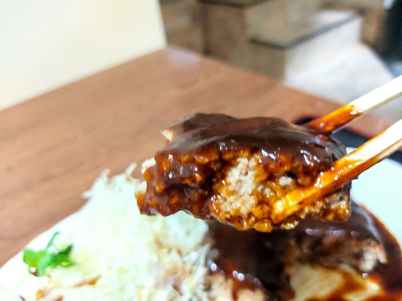 デミグラスソースは甘塩っぱい感じのソースですがハンバーグにはよく合います