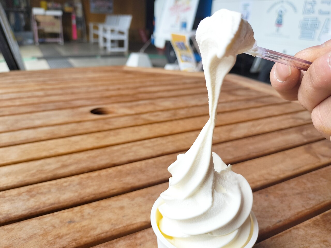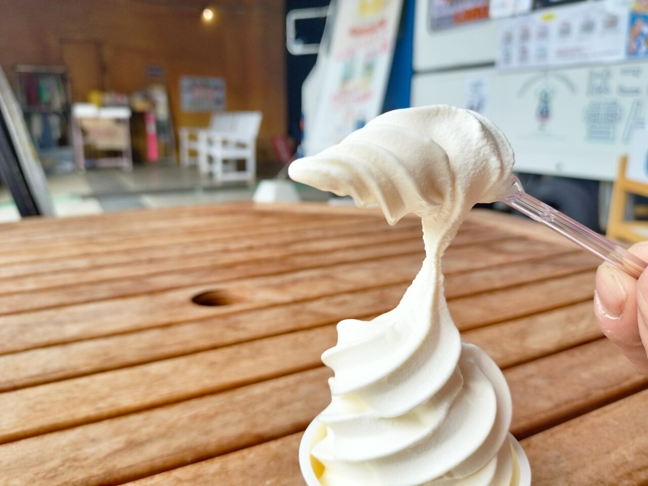 スプーンで掬ってみると… 伸びるソフトクリームで粘り気があるんです