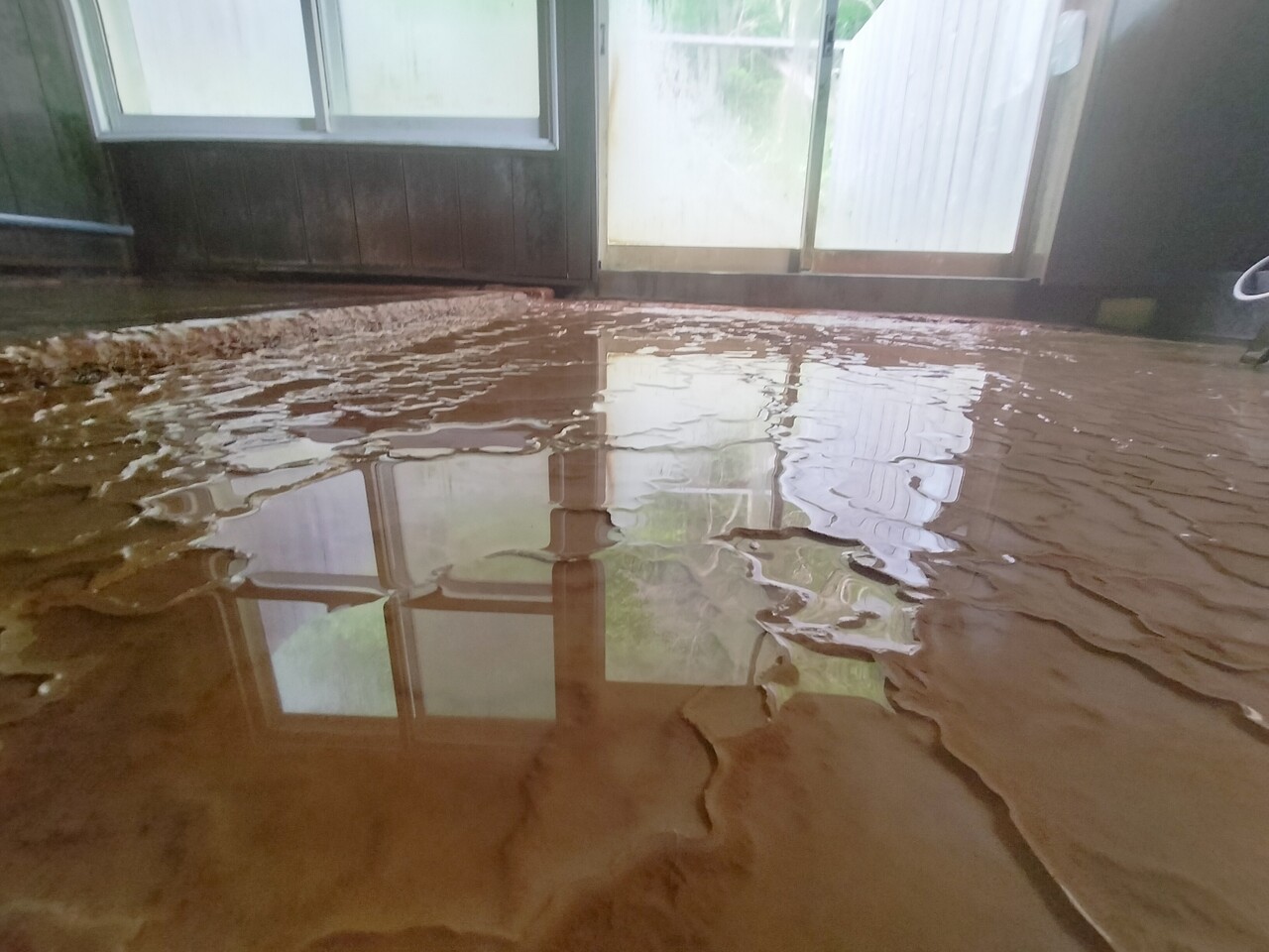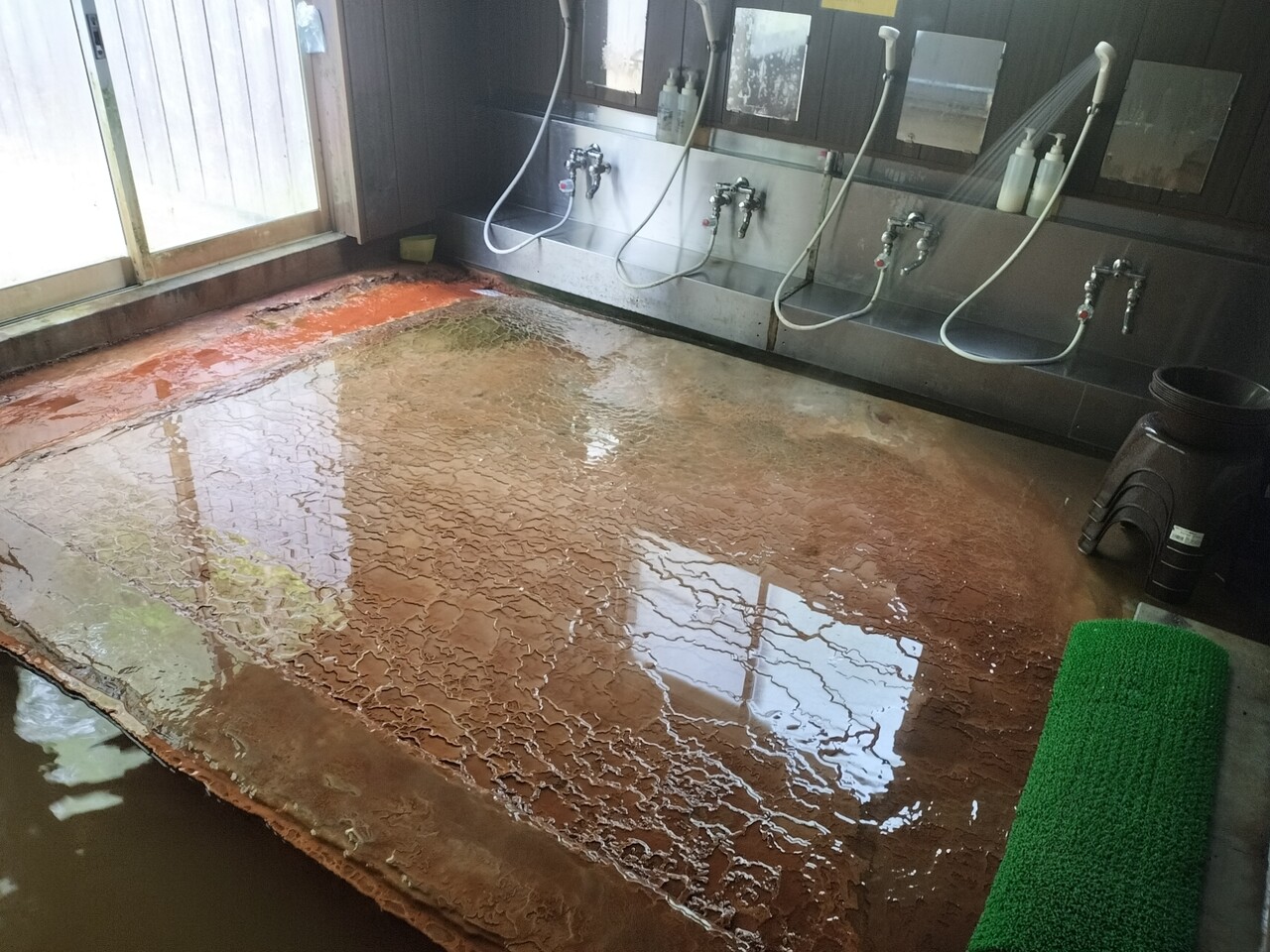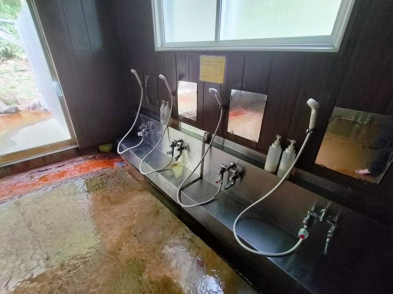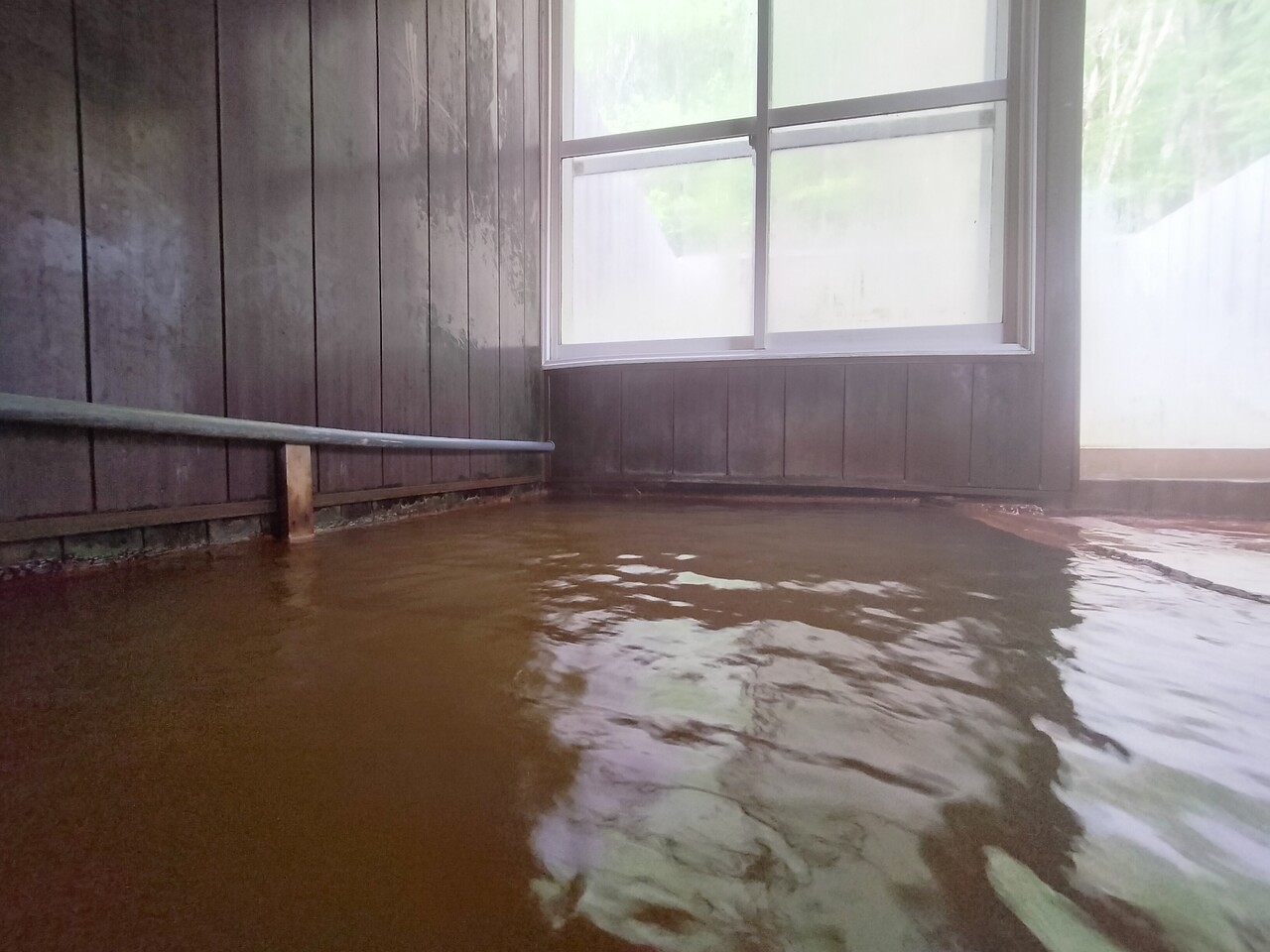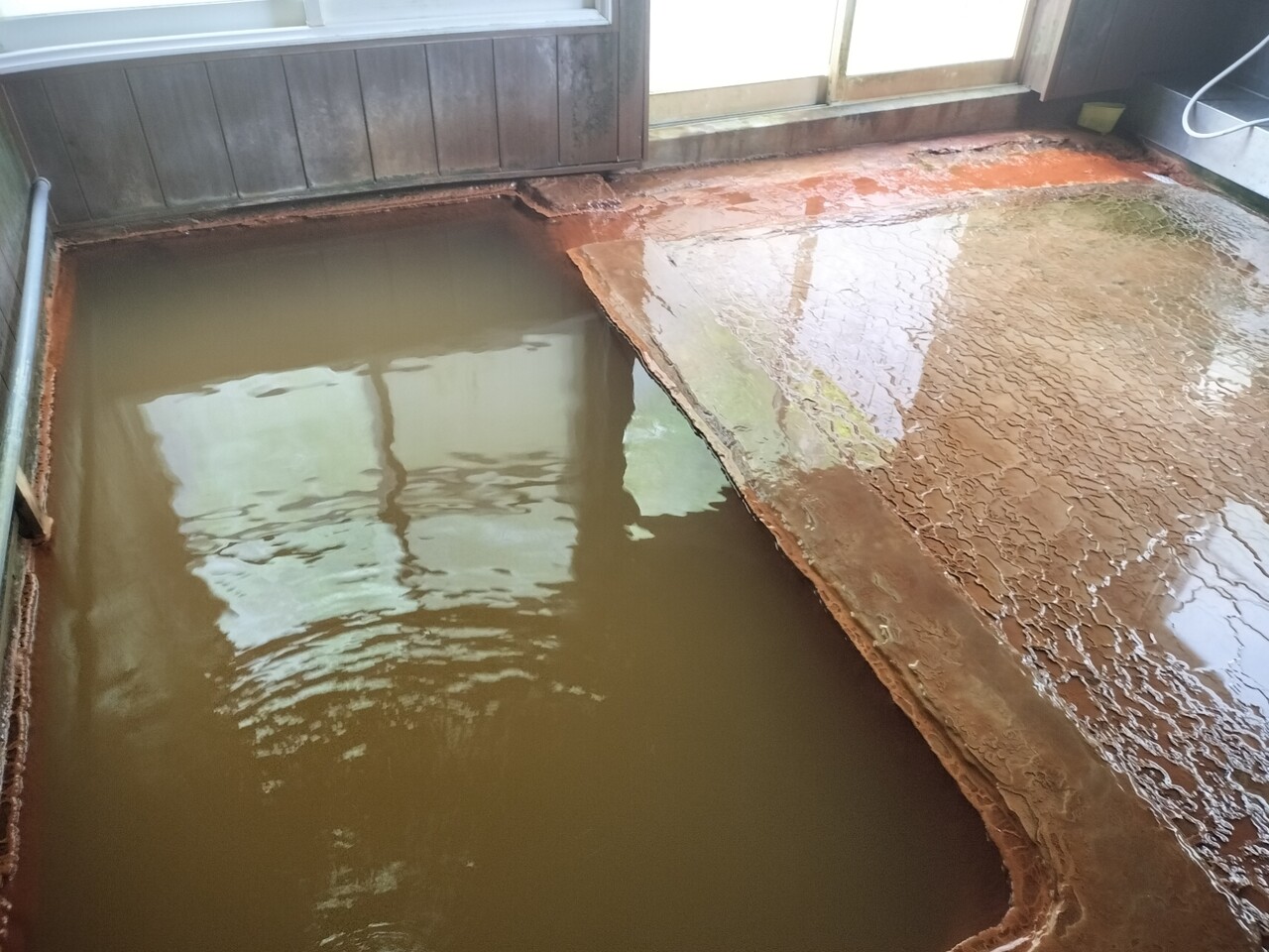 向かって左には内湯があり 源泉掛け流しで濃い黄土色の温泉ですが窓側の窪みからオーバーフローしております