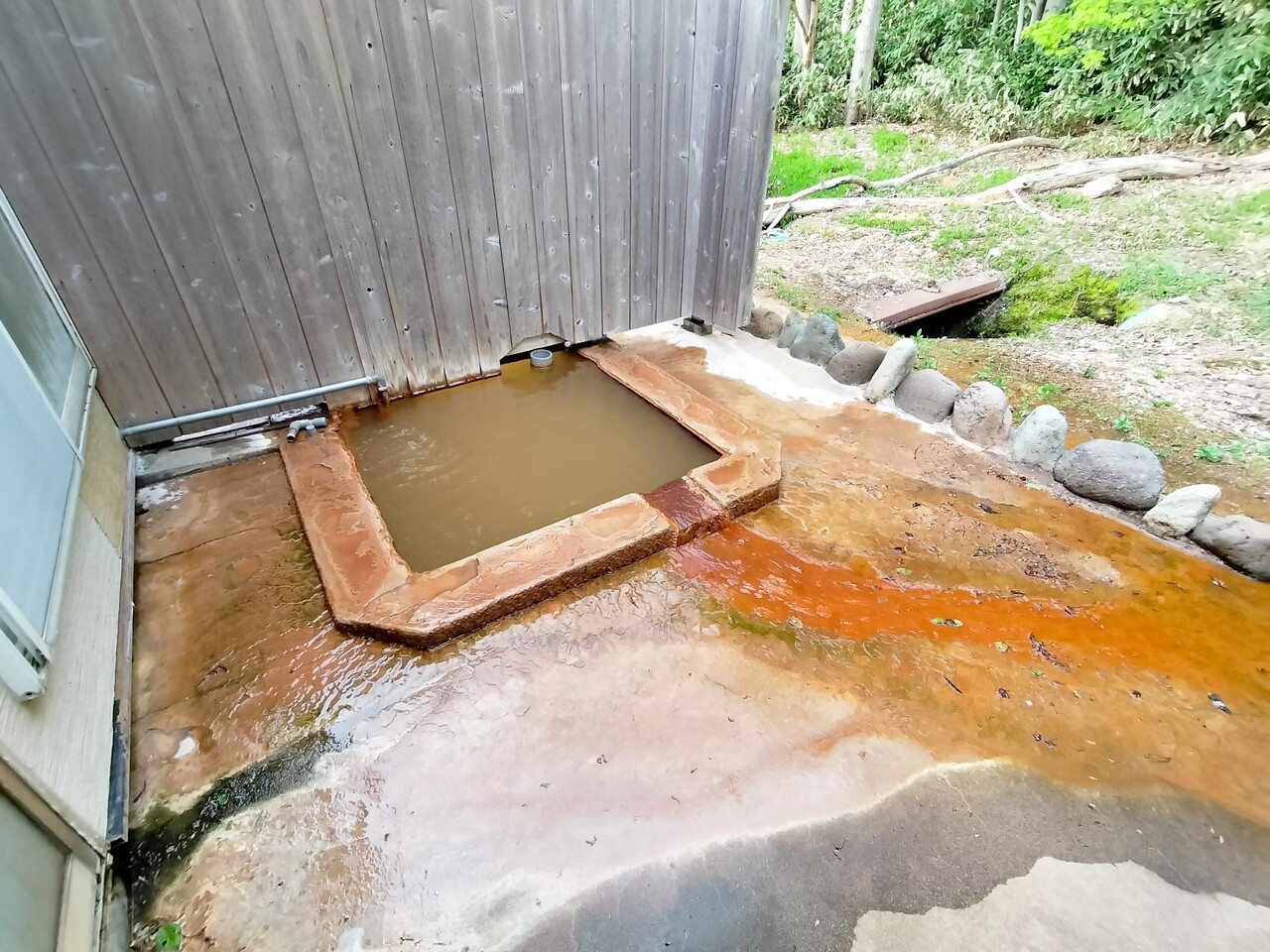 露天風呂もあり向かうと 1人サイズの小さい露天風呂ですが こちらも源泉掛け流しの温泉でした