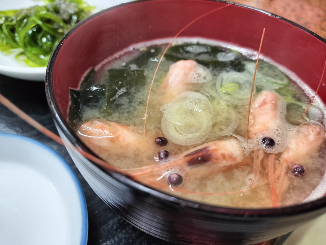 エビの頭の味噌汁(ワカメ、長ネギ、エビ頭)