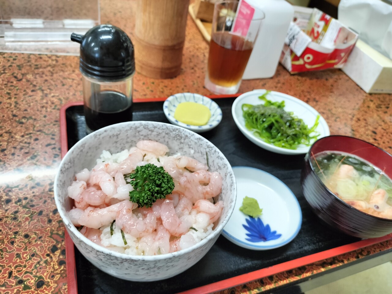 席に座しまして 麦茶を頂き 秒でエビ丼をオーダー致します。その際に酢飯でも良いですか?と問われたので即答酢飯で!