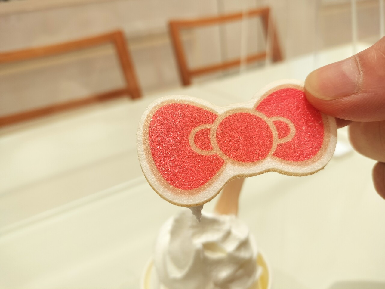 キテイちゃんのリボンのお菓子が添えられているソフトクリームとなります