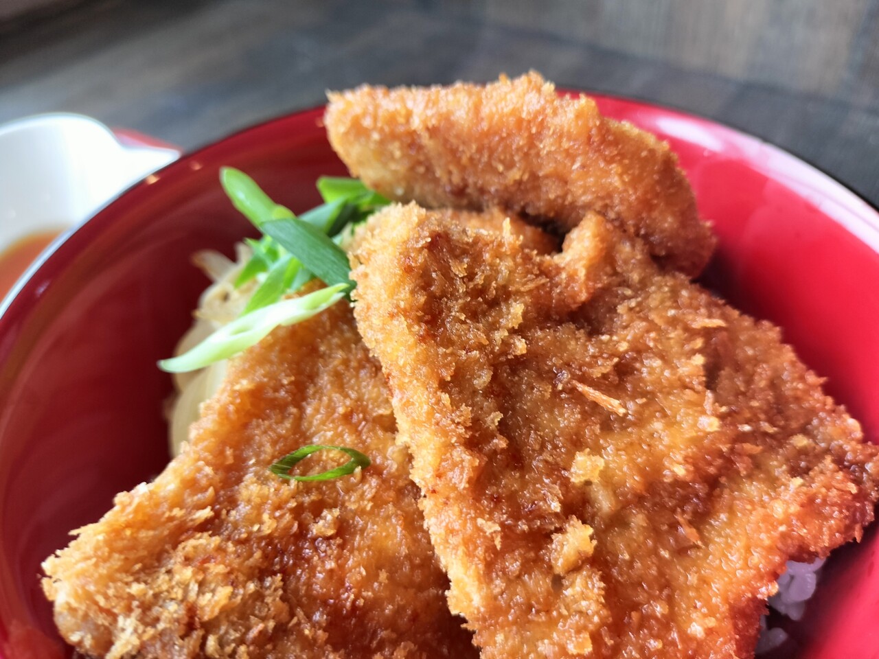 3枚のトンカツが乗ったカツ丼(長ネギ、玉ねぎ