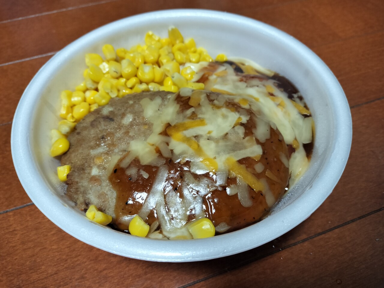 蓋を開けるとこんな感じで 内容は 照焼ハンバーグ、チーズ、コーン、ご飯の内容となります