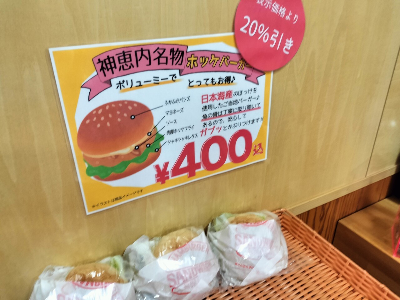 神恵内名物ホッケーバーガー(¥400)そして2割引き… 魅力ですね笑