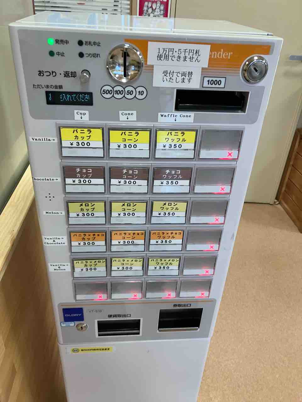メロンミックスのソフトクリームをカップ(¥300)を食券機で購入します
