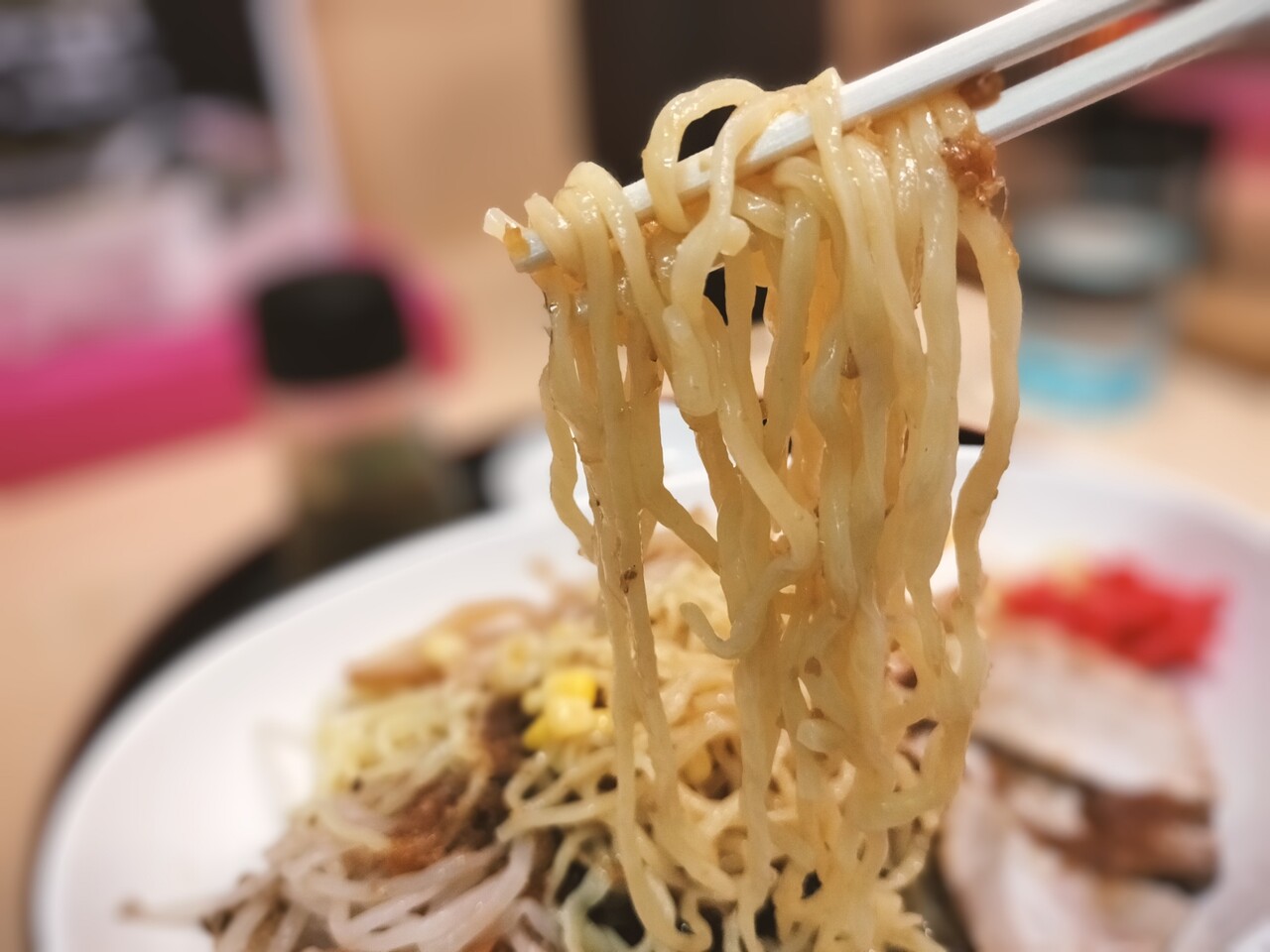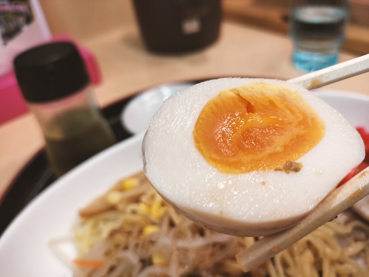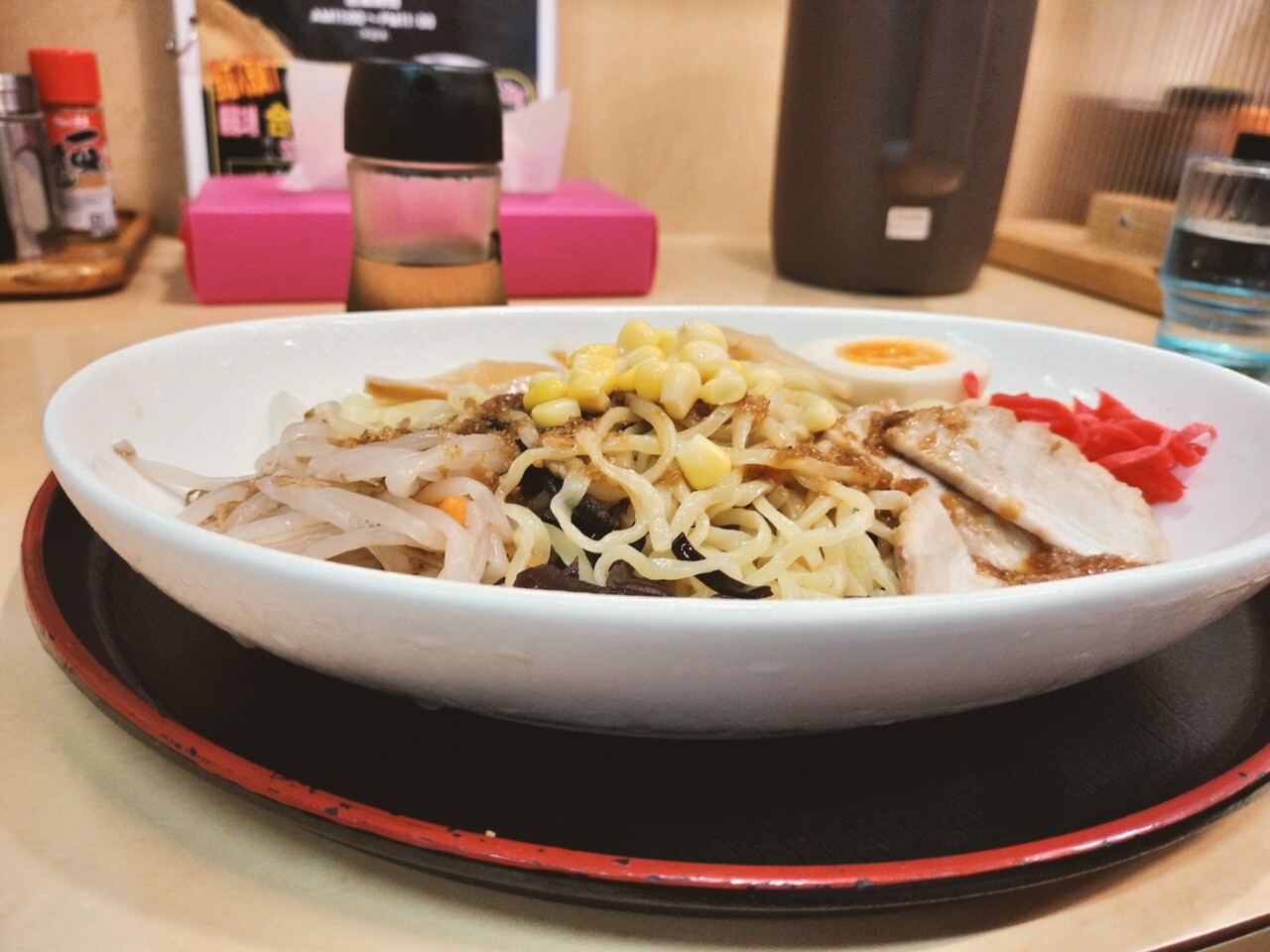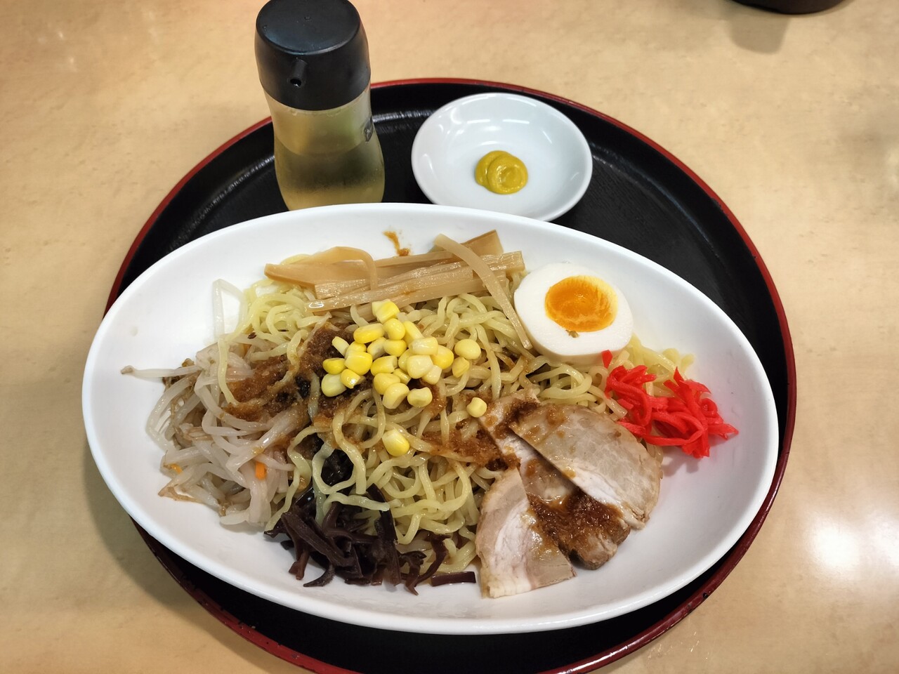 具材はもやし、人参、キクラゲ、メンマ、コーン、チャーシュー、ゆで卵、紅生姜。別皿には辛子、そして酢が用意されております