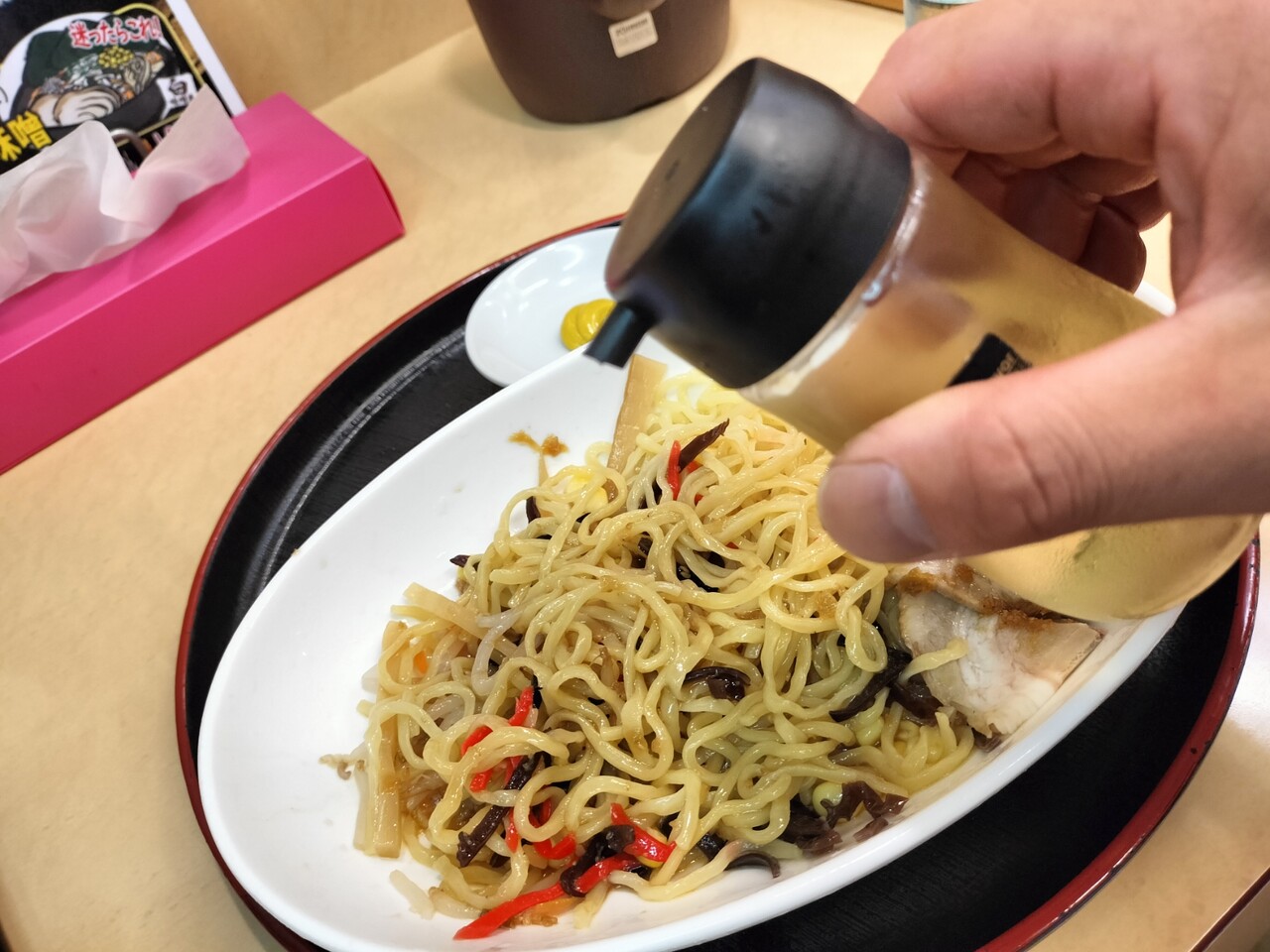 美味い美味いと麺を食べ進めていきますが せっかく酢があるので甘辛い味付けを味変しようと