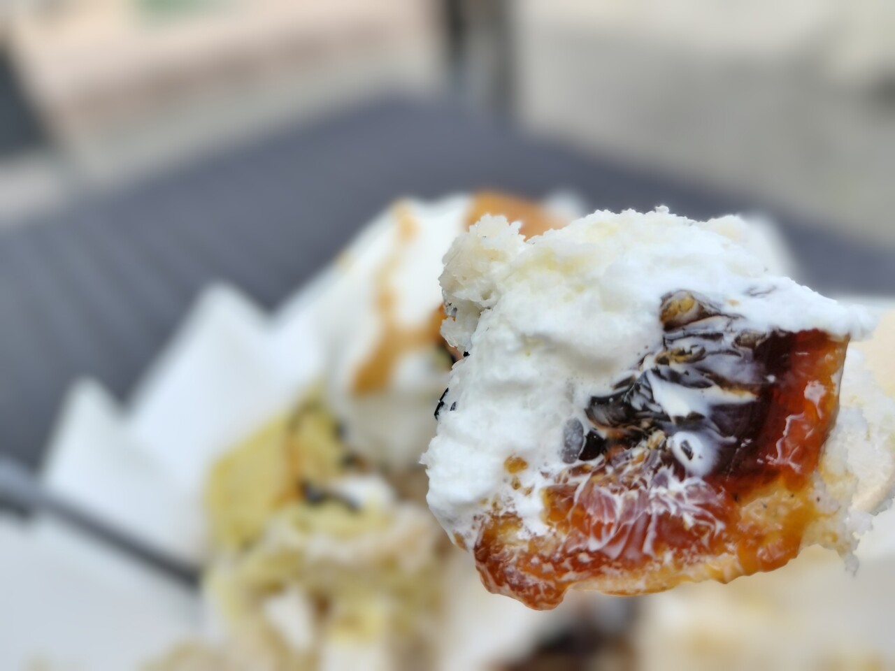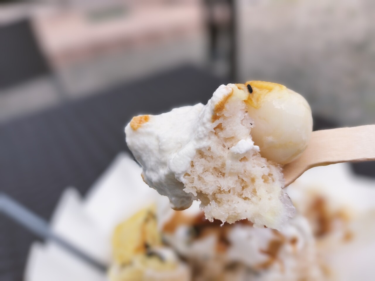 中を探ると ゼリーが潜んでおり何かなと思い生クリームと一緒に食べると正体は黒蜜で 美味っ