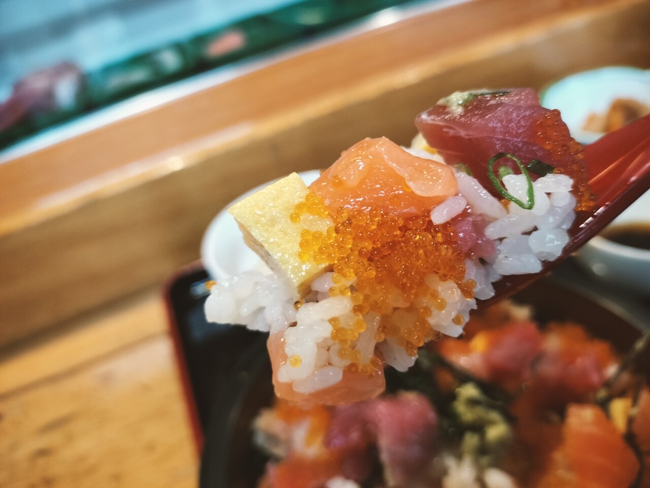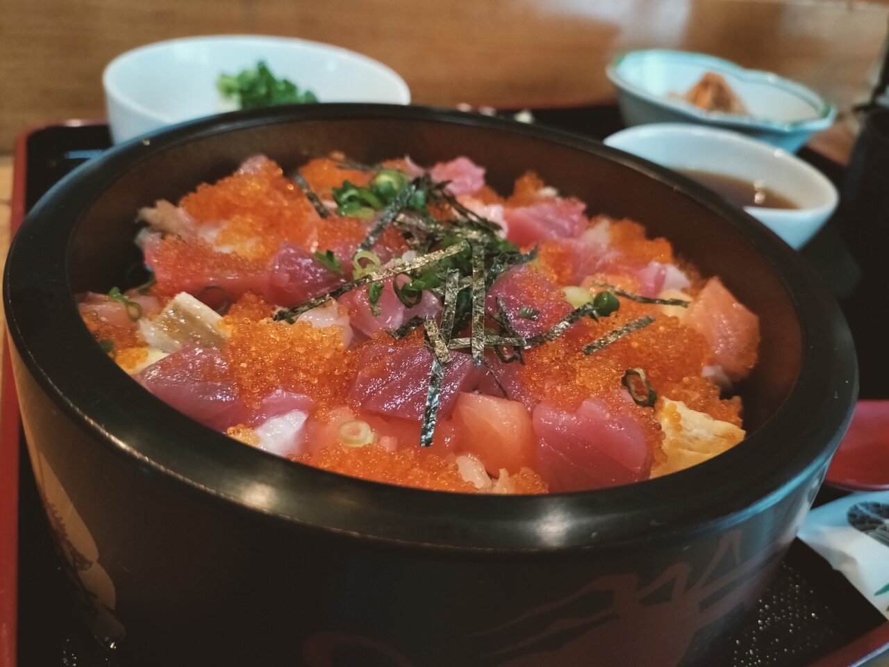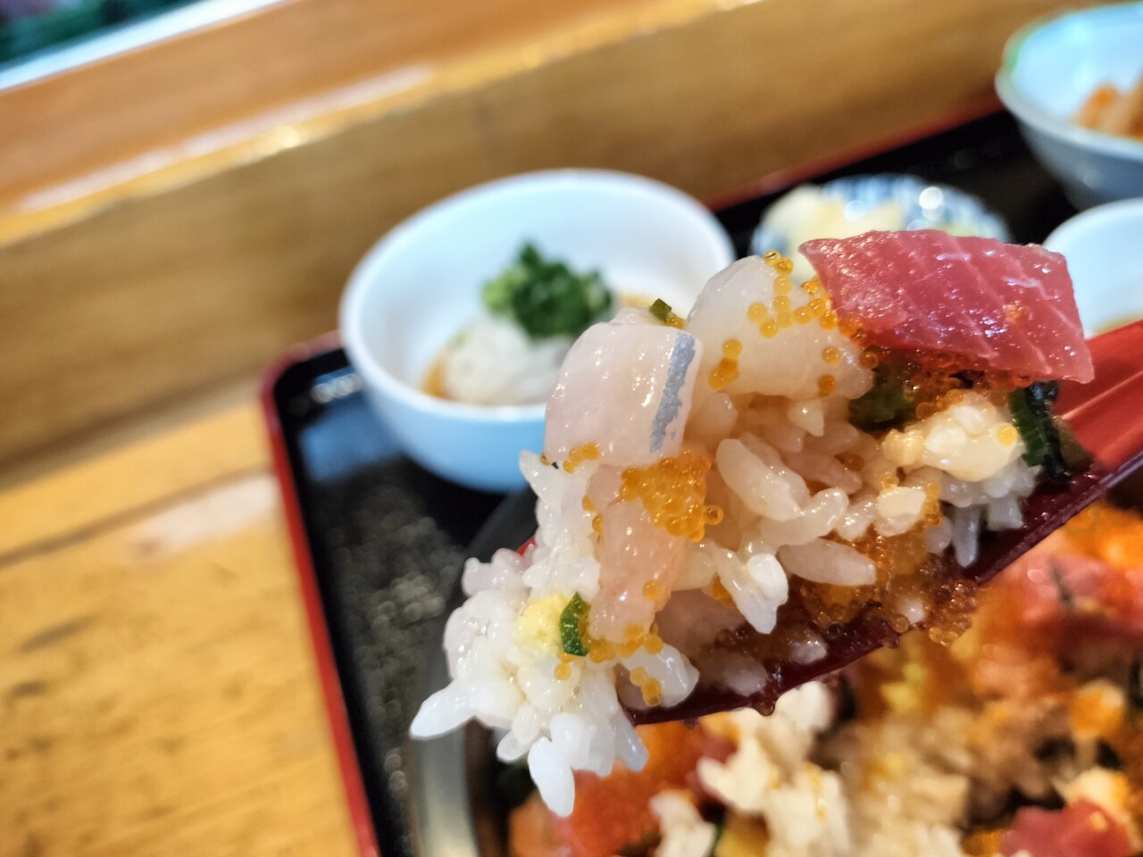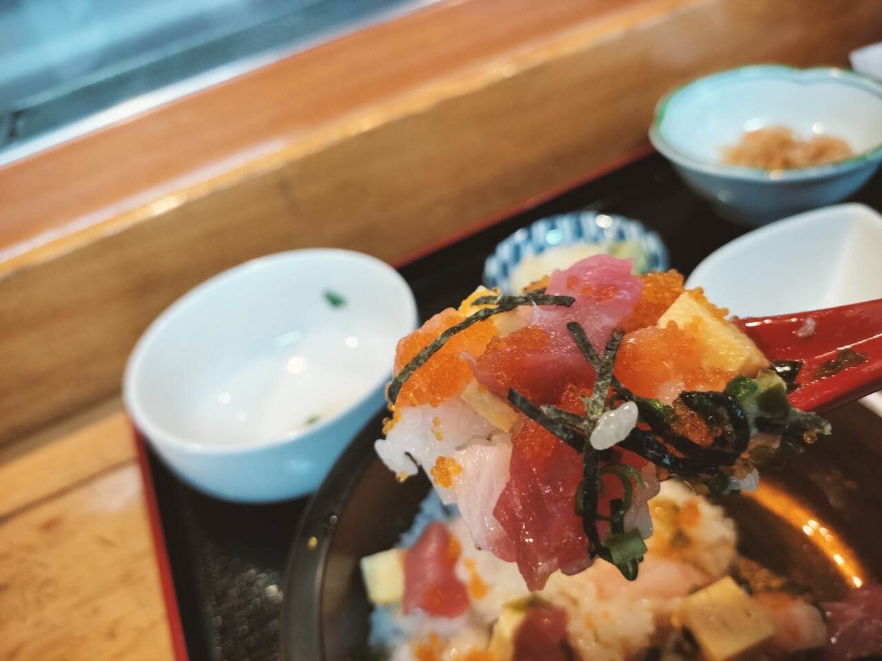 沢山の素材が盛り付けられた海鮮バラちらし(鮪、サーモン、海老、穴子、白身魚、とびっ子、卵焼き、海苔)