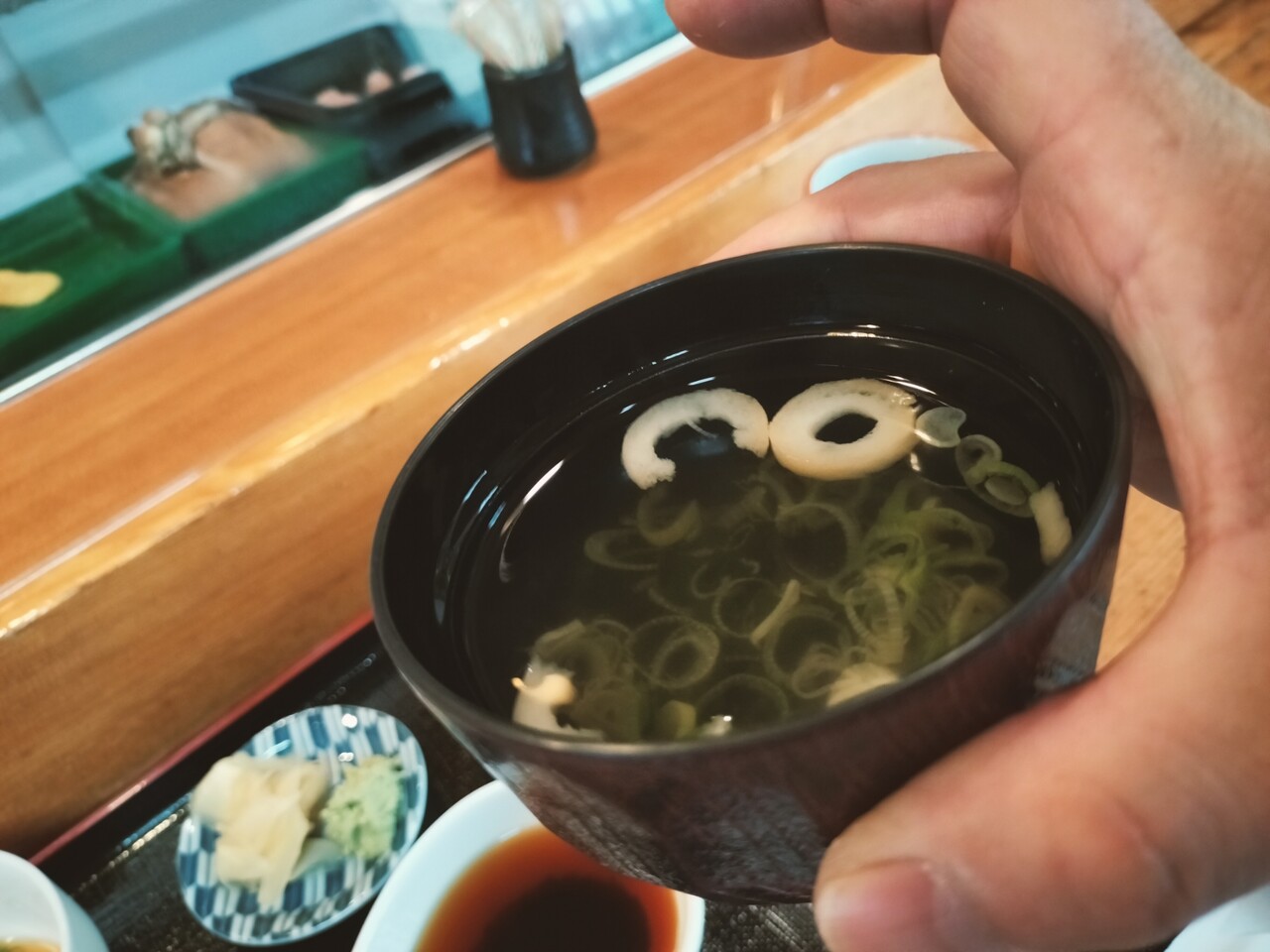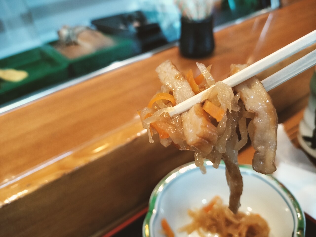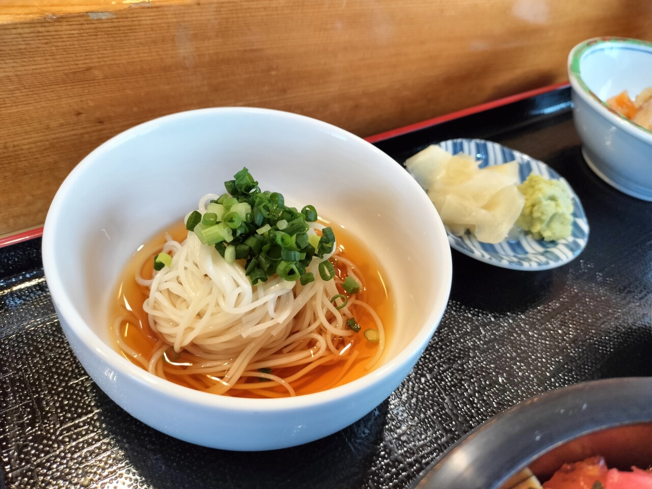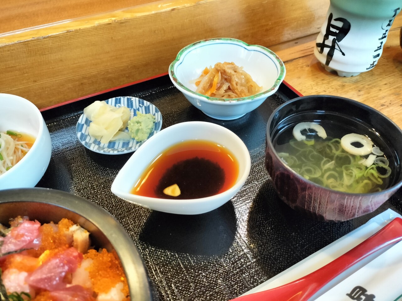 小鉢(切り干し大根)、お吸い物、がごめ昆布のタレ、ガリとわさび