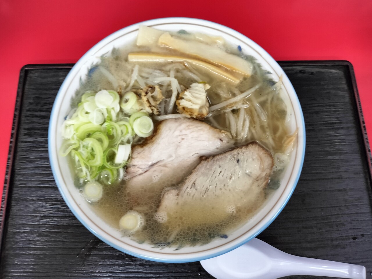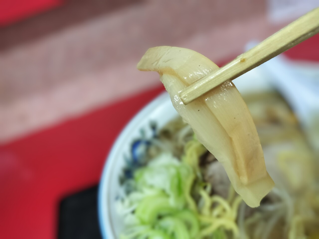 主張強めのチャーシュー、中に沈んでいる稚貝、メンマ、もやし、長ネギの具材となっております
