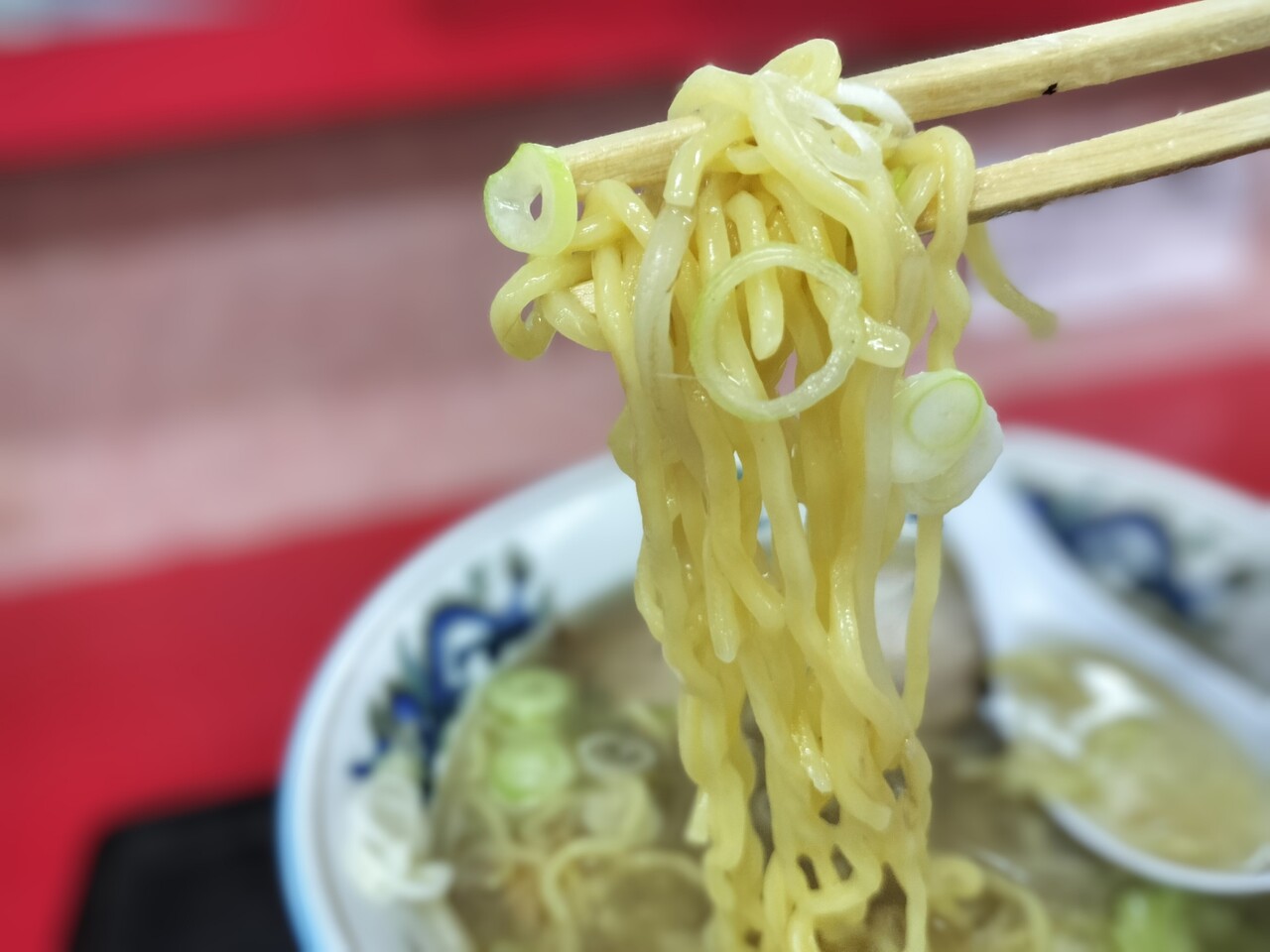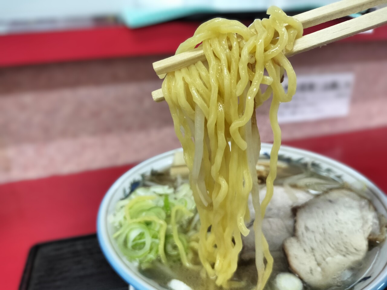 ラーメンを持ち上げると 西山製麺の黄色麺