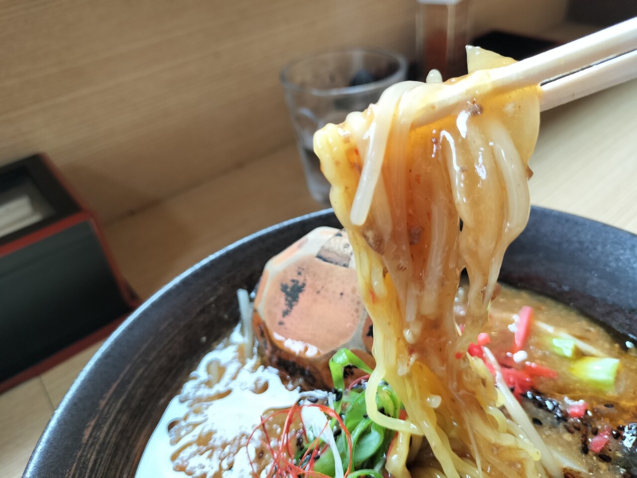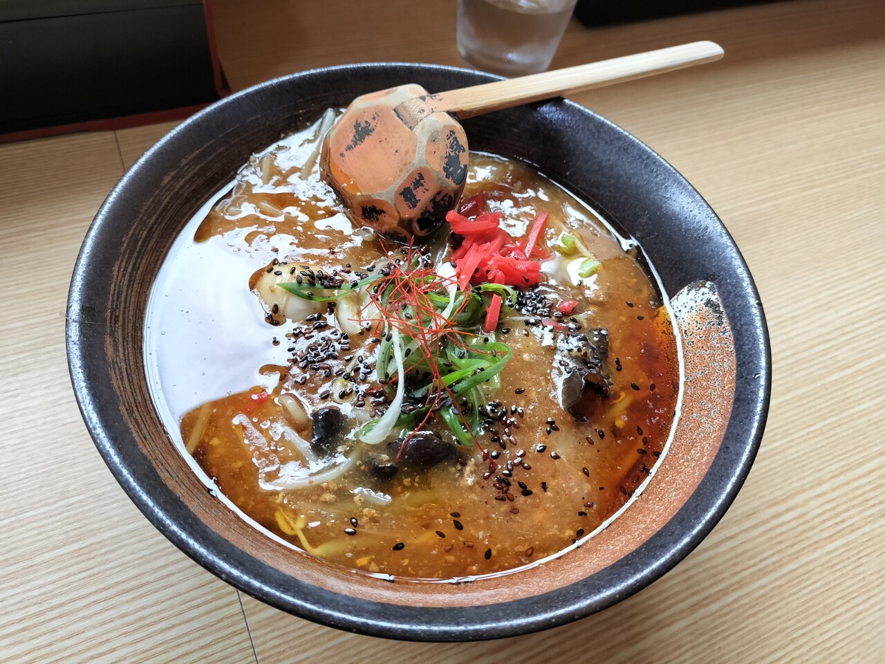 具沢山なラーメンです(キクラゲ、もやし、長ネギ、玉ねぎ、白菜、椎茸、青梗菜、うずらの卵、糸唐辛子、挽肉、紅生姜、胡麻)