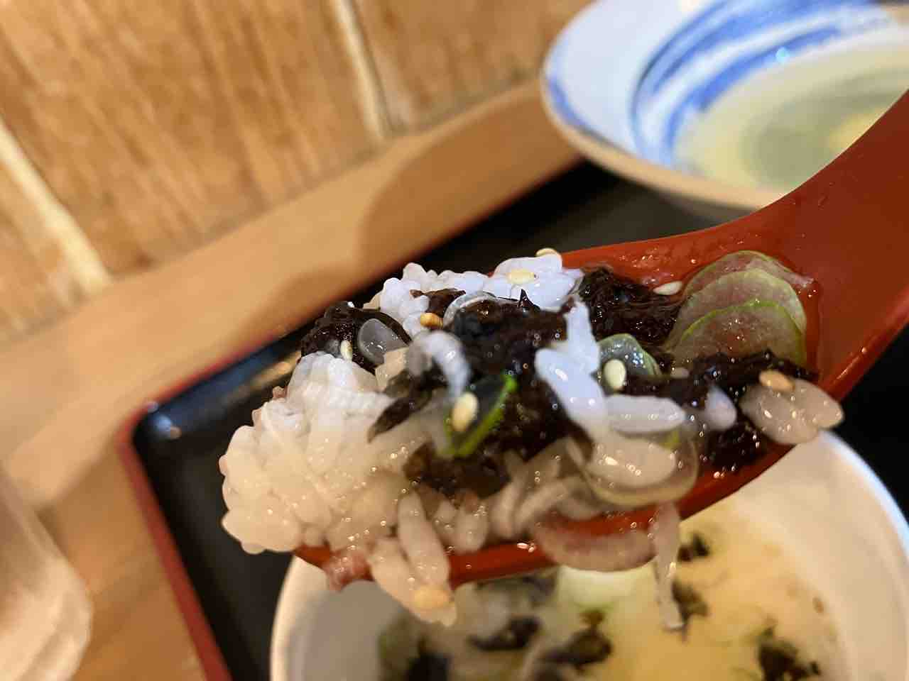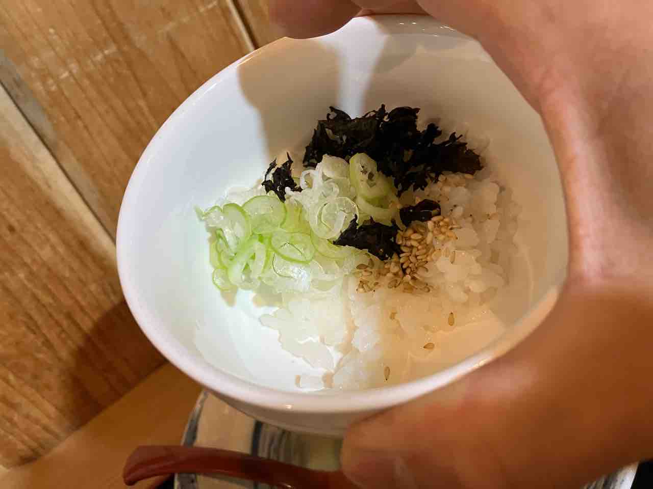 そして洗い飯(ご飯、長ネギ、バラ海苔、白胡麻)
