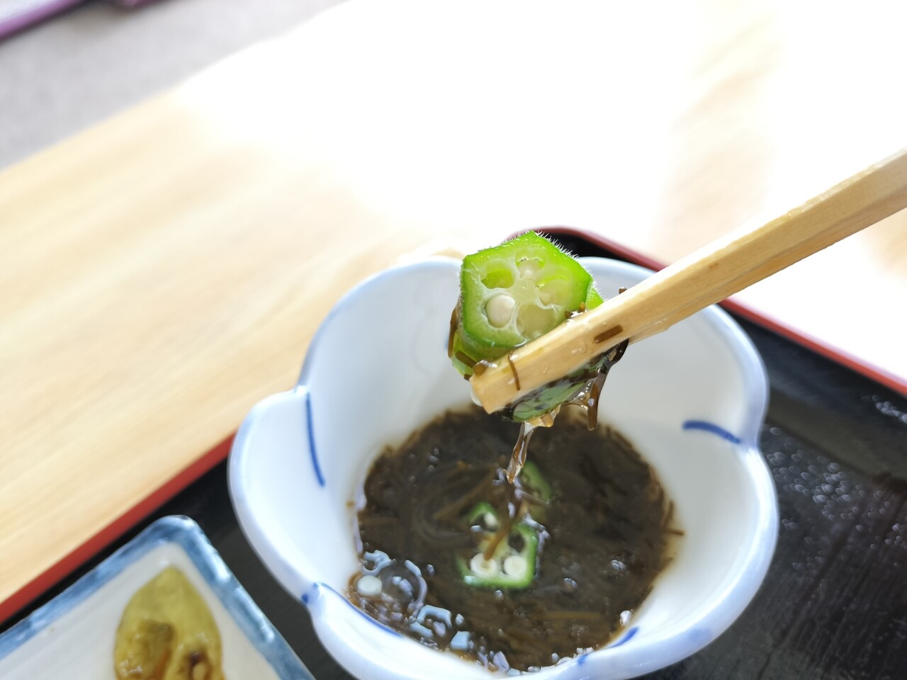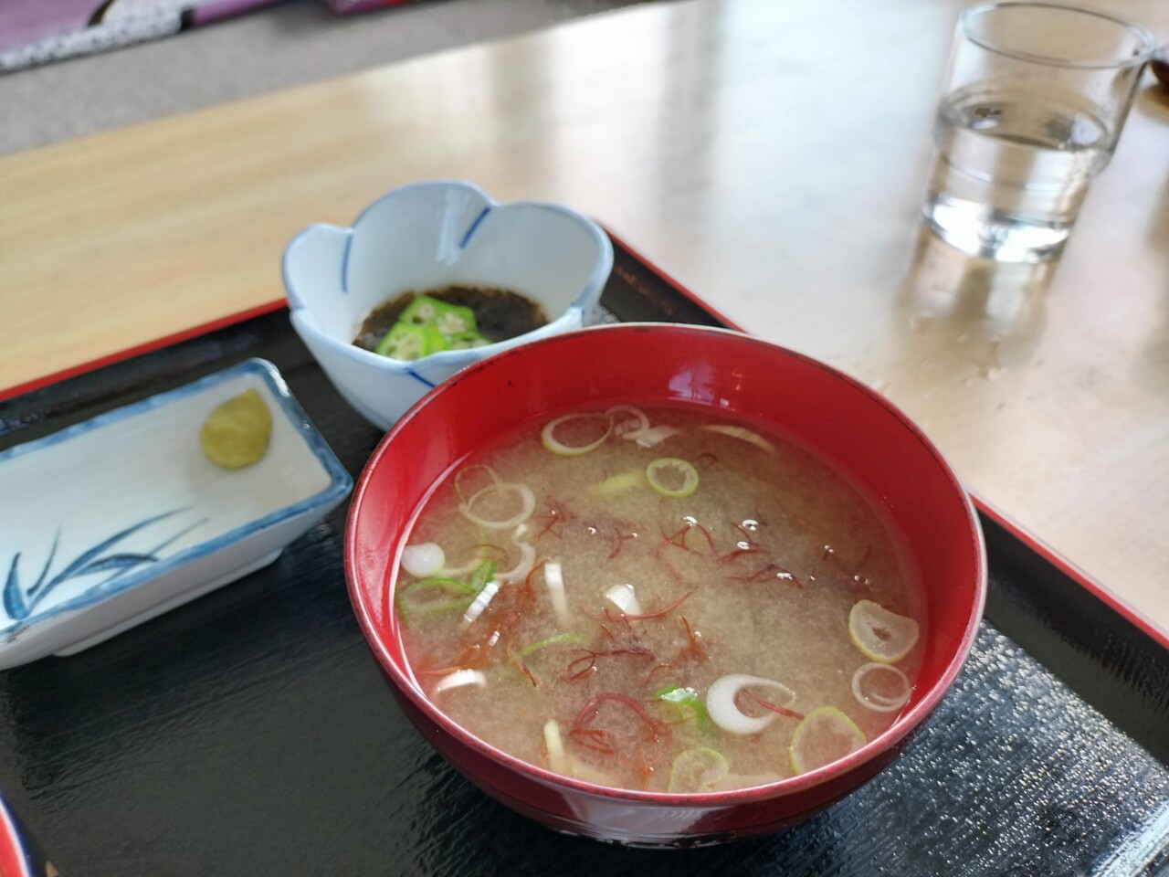 ふのりと長ネギの味噌汁、めかぶとオクラのポン酢和え、沢庵