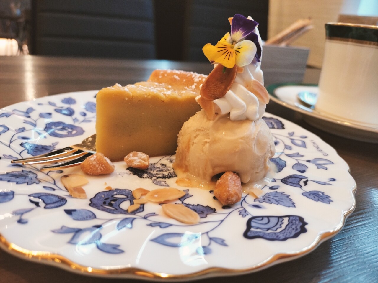 ケーキの横にはアイスクリームが添えられており 花がアクセントとなっております