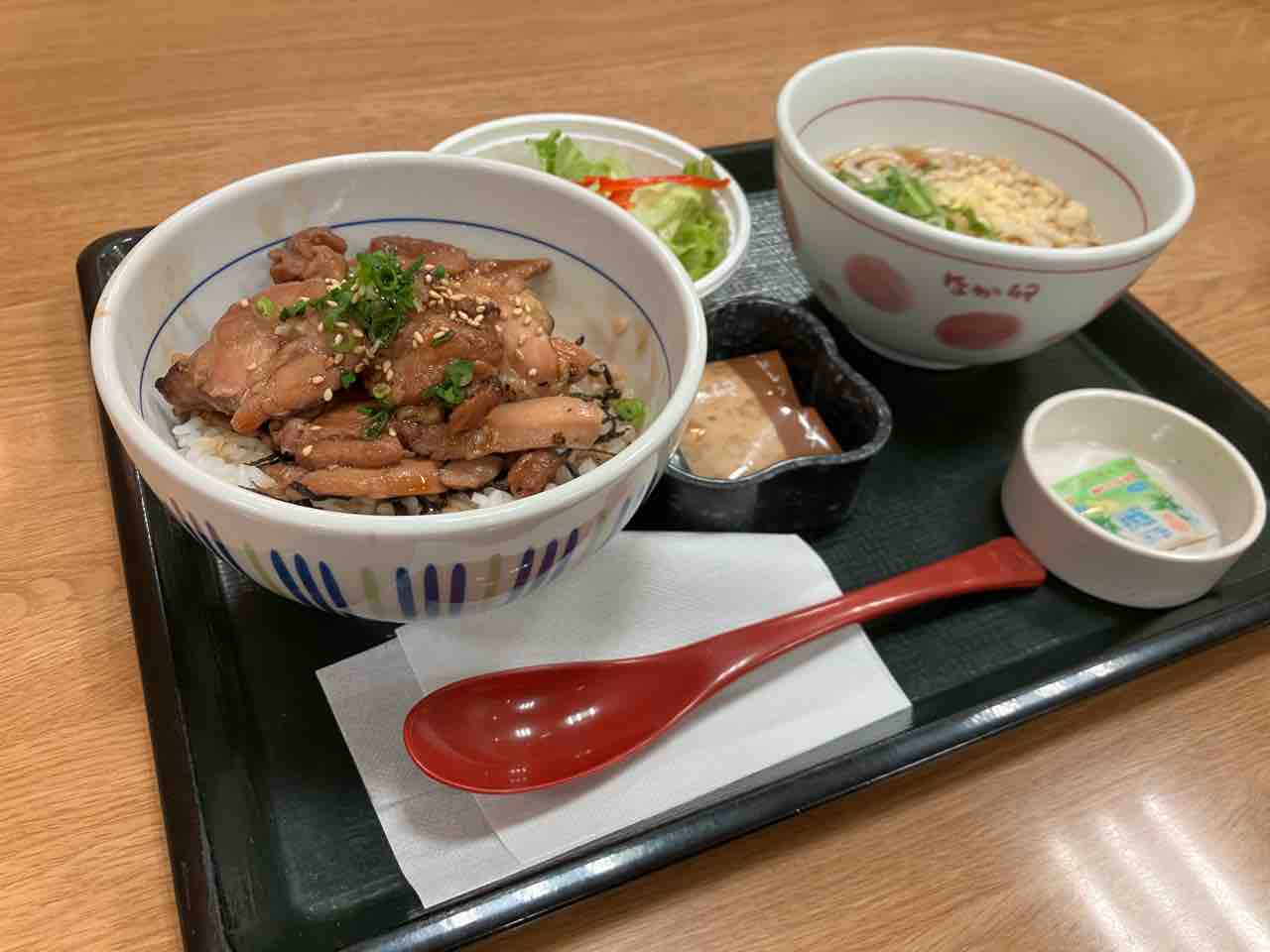 鶏の照り焼き丼とサラダうどんのセットが運ばれてきました