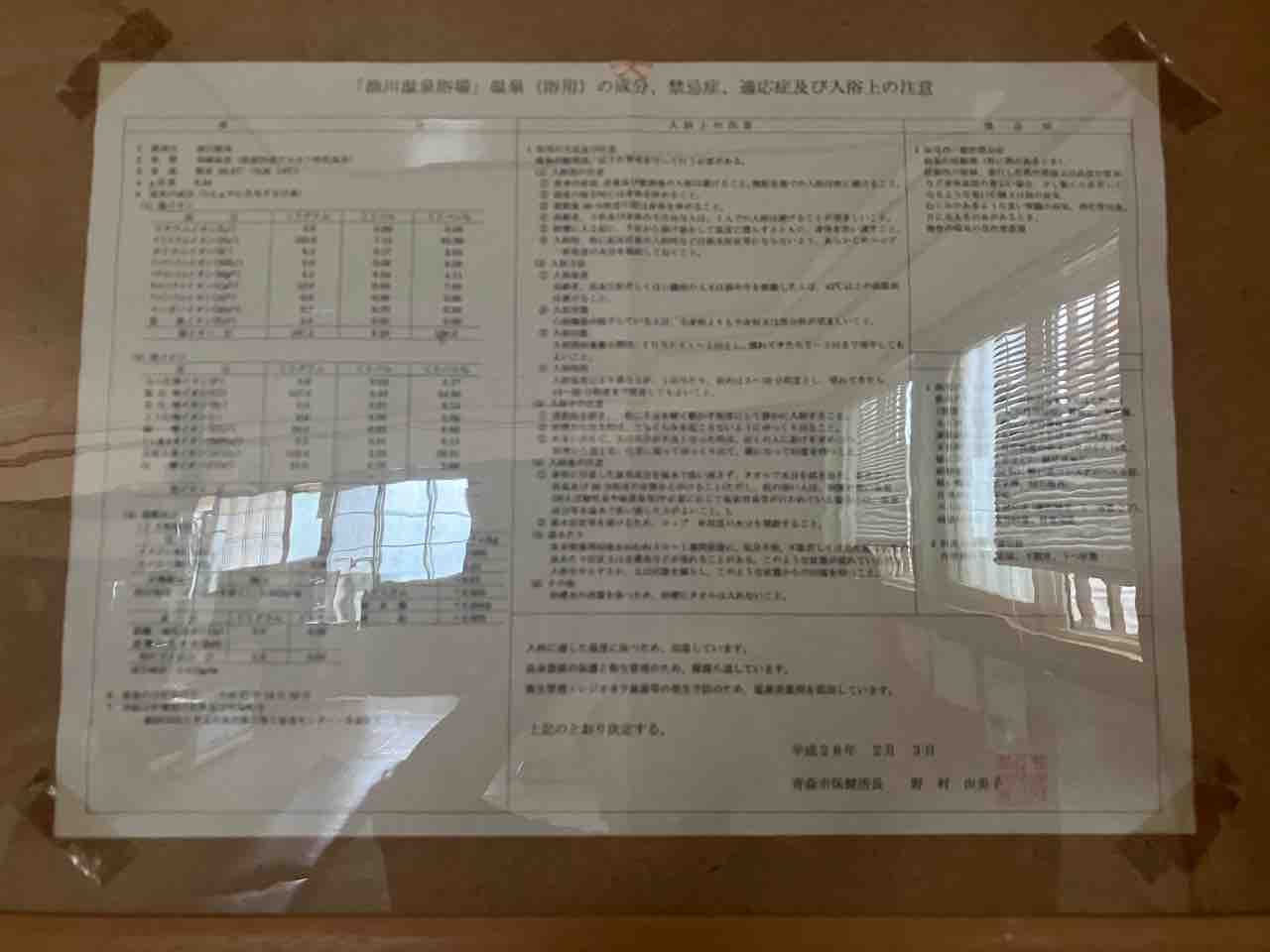 泉質は 単純温泉(低張性弱アルカリ性)源泉温度25.2℃ PH値8.34 メタ珪酸83.7mg 溶存物質0.622mg/kg