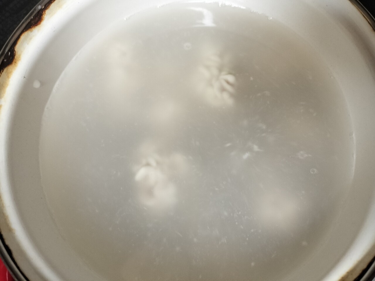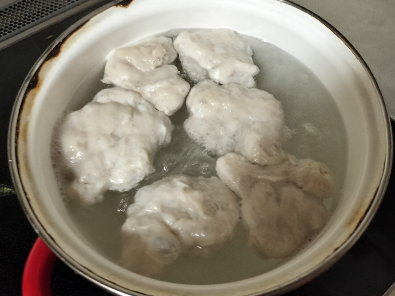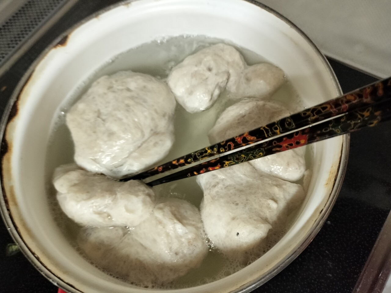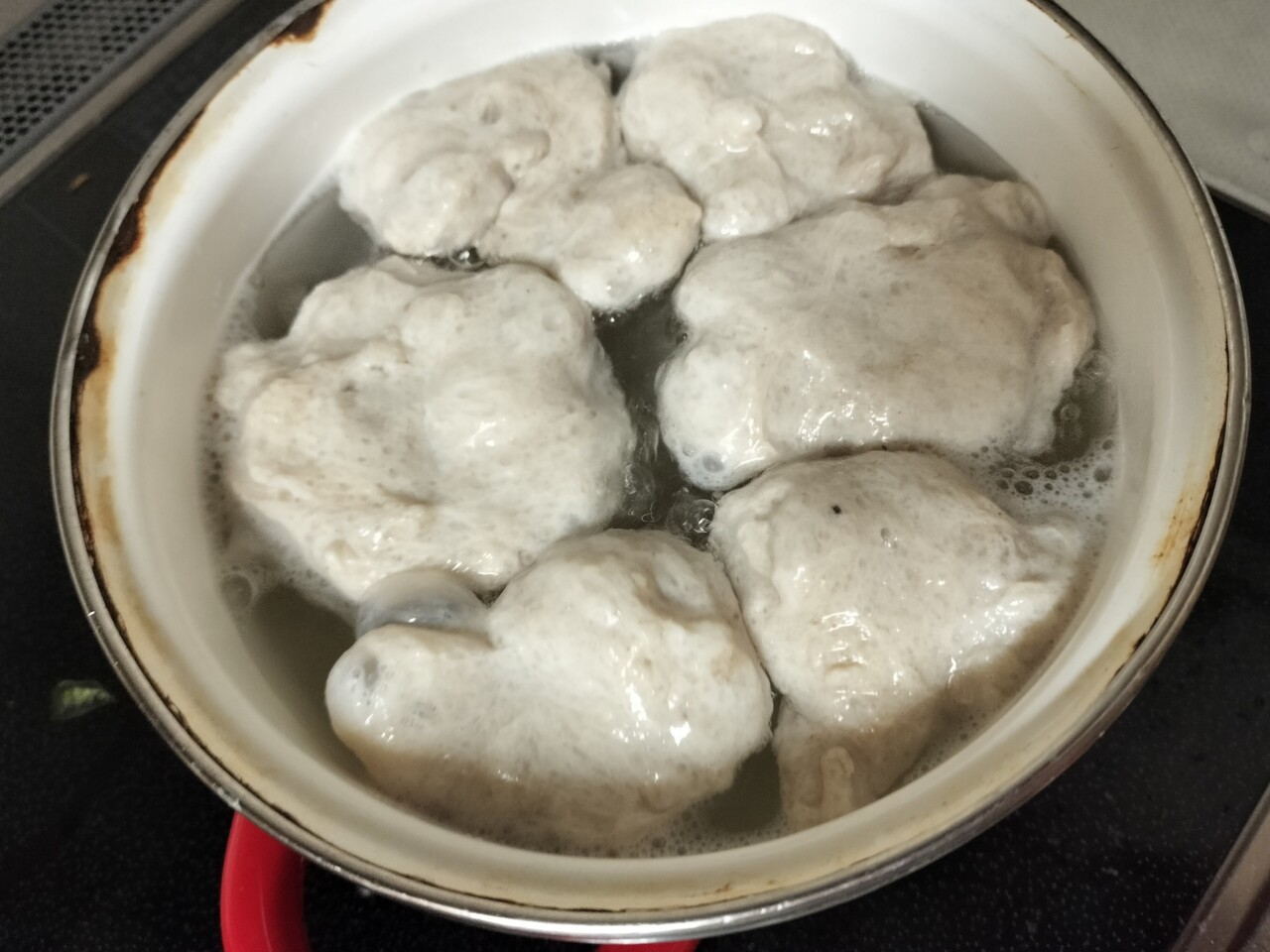 沸騰した湯に投入し 助たち入れて一気に温度が下がるので 沸騰しない温度茹でていきます