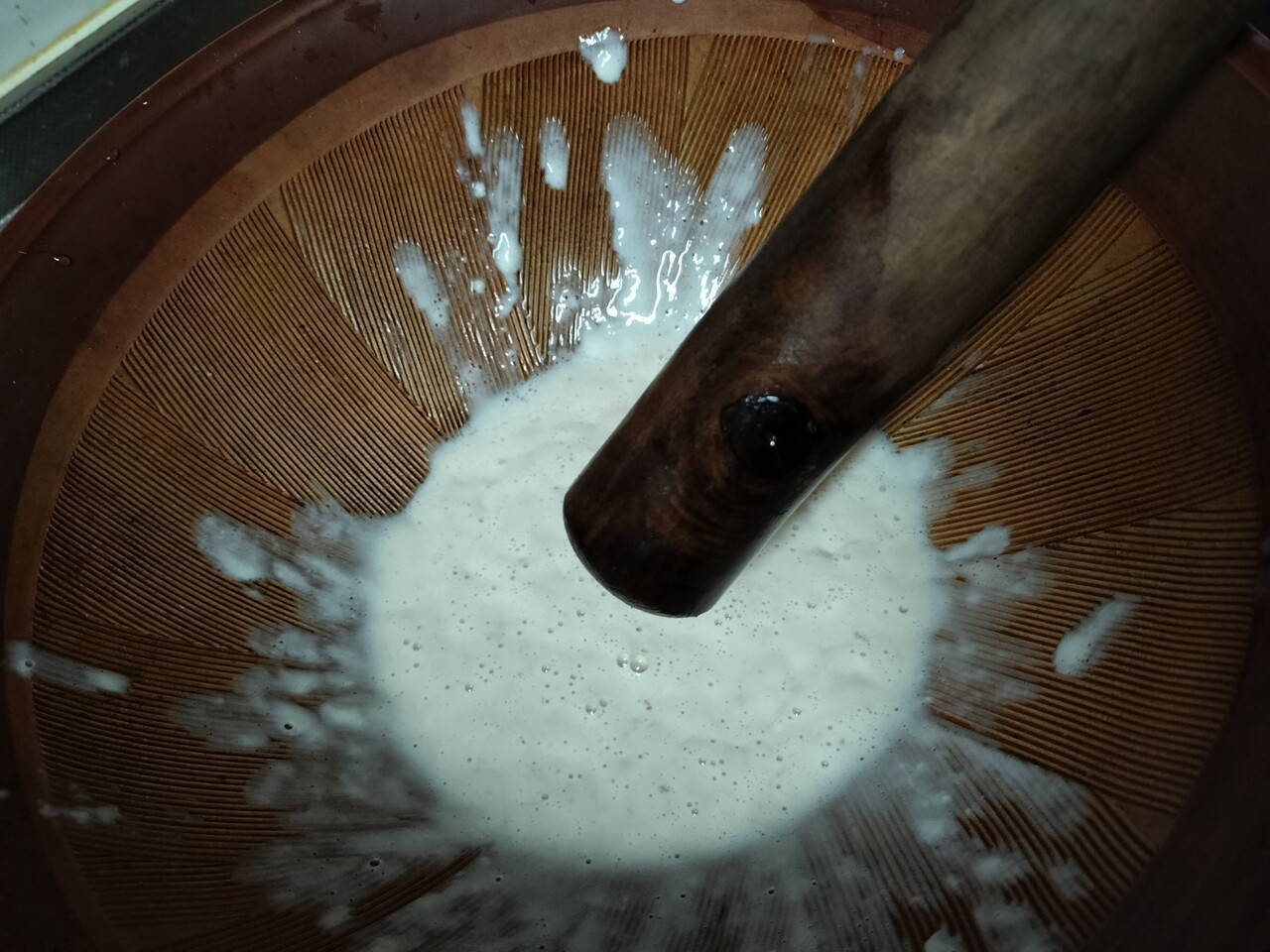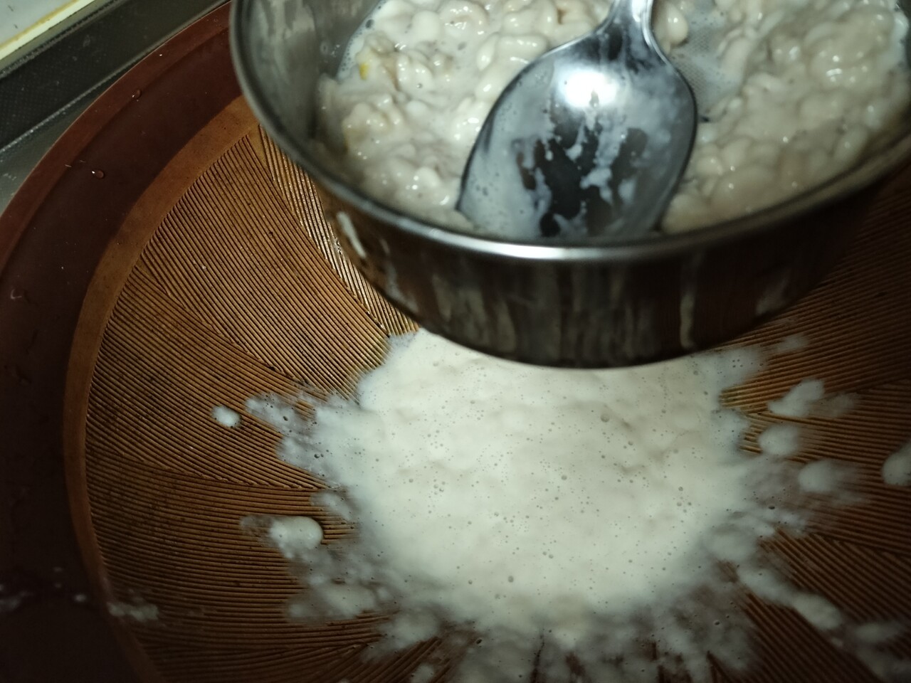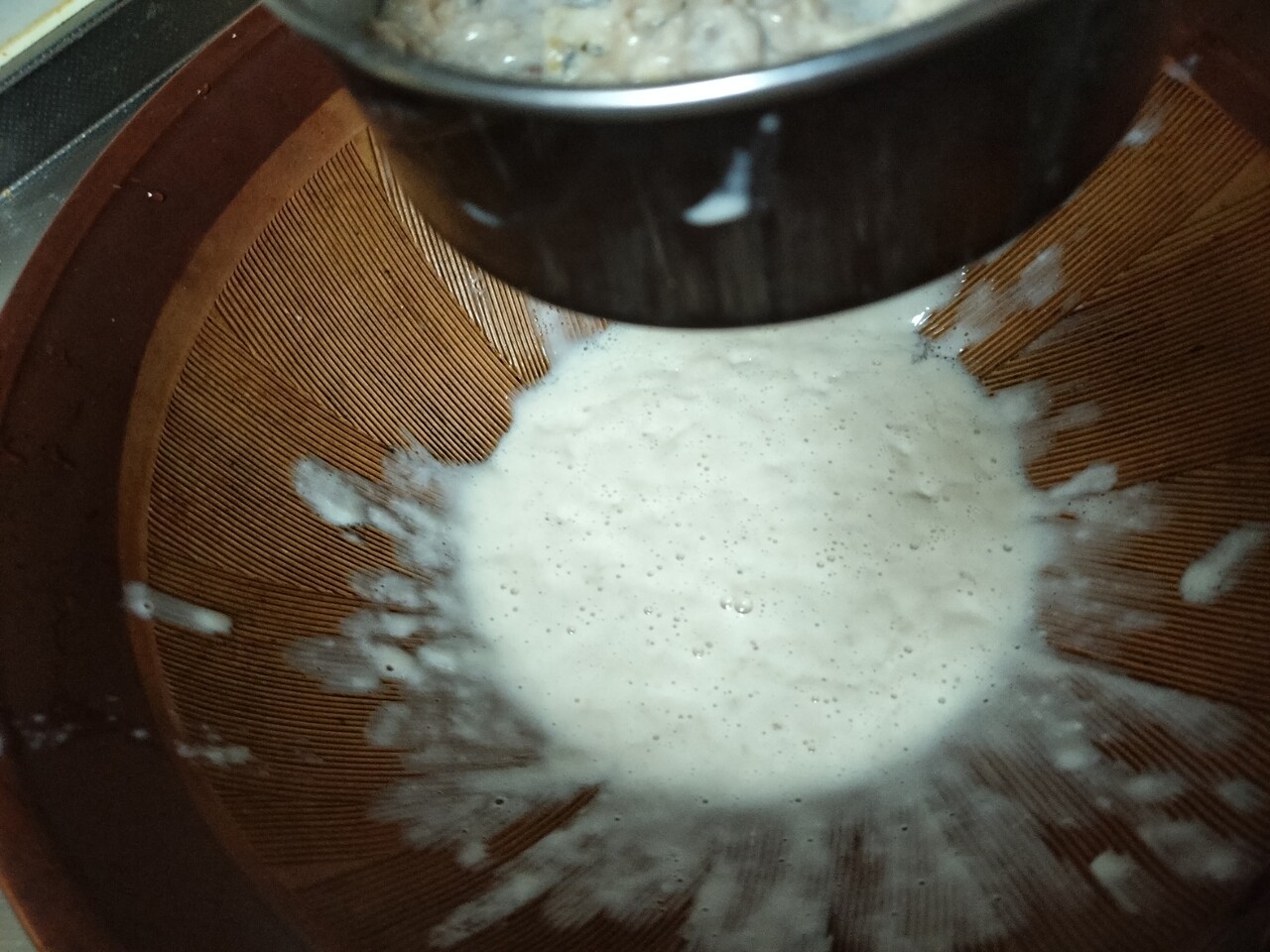 助たちの 濾された液体がすり鉢に溜まり