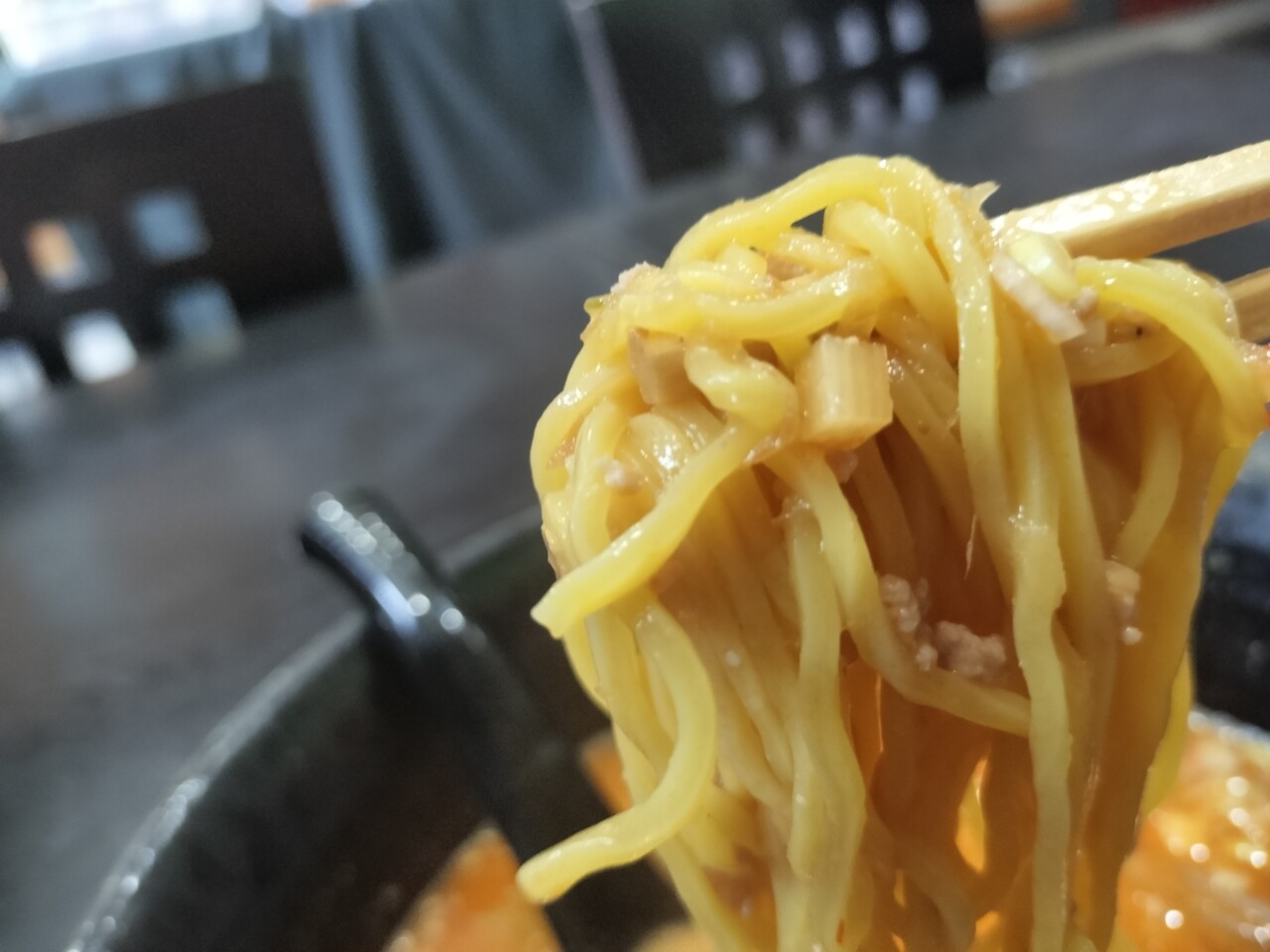 更に麺を掴むと 肉味噌、もやし、も絡まり